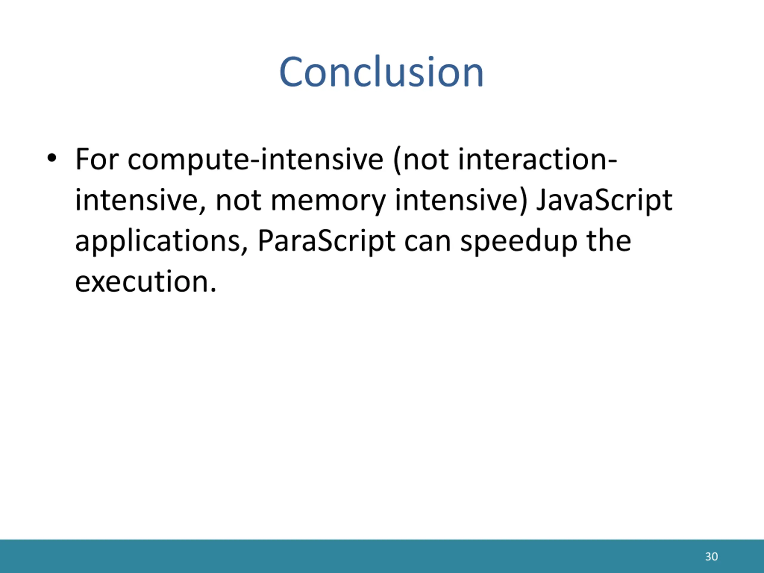 Conclusion For compute-intensive (not interaction- intensive, not memory intensive) JavaScript applications, ParaScript can speedup the execution. 30