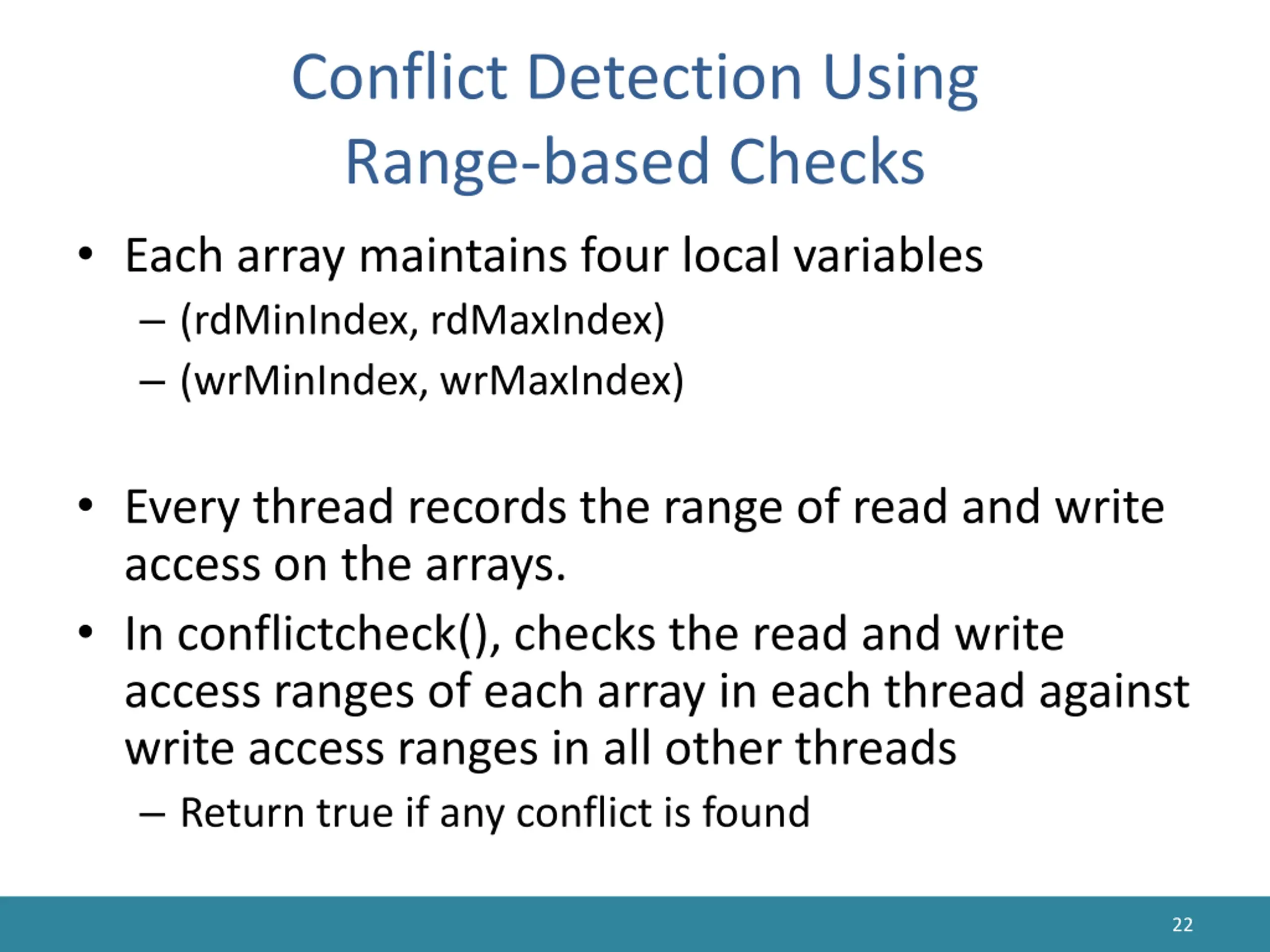 Conflict Detection Using Range-based Checks Each array maintains four local variables (rdMinIndex, rdMaxIndex) (wrMinIndex, wrMaxIndex) Every thread records the range of read and write access on the arrays. In conflictcheck(), checks the read and write access ranges of each array in each thread against write access ranges in all other threads Return true if any conflict is found 22