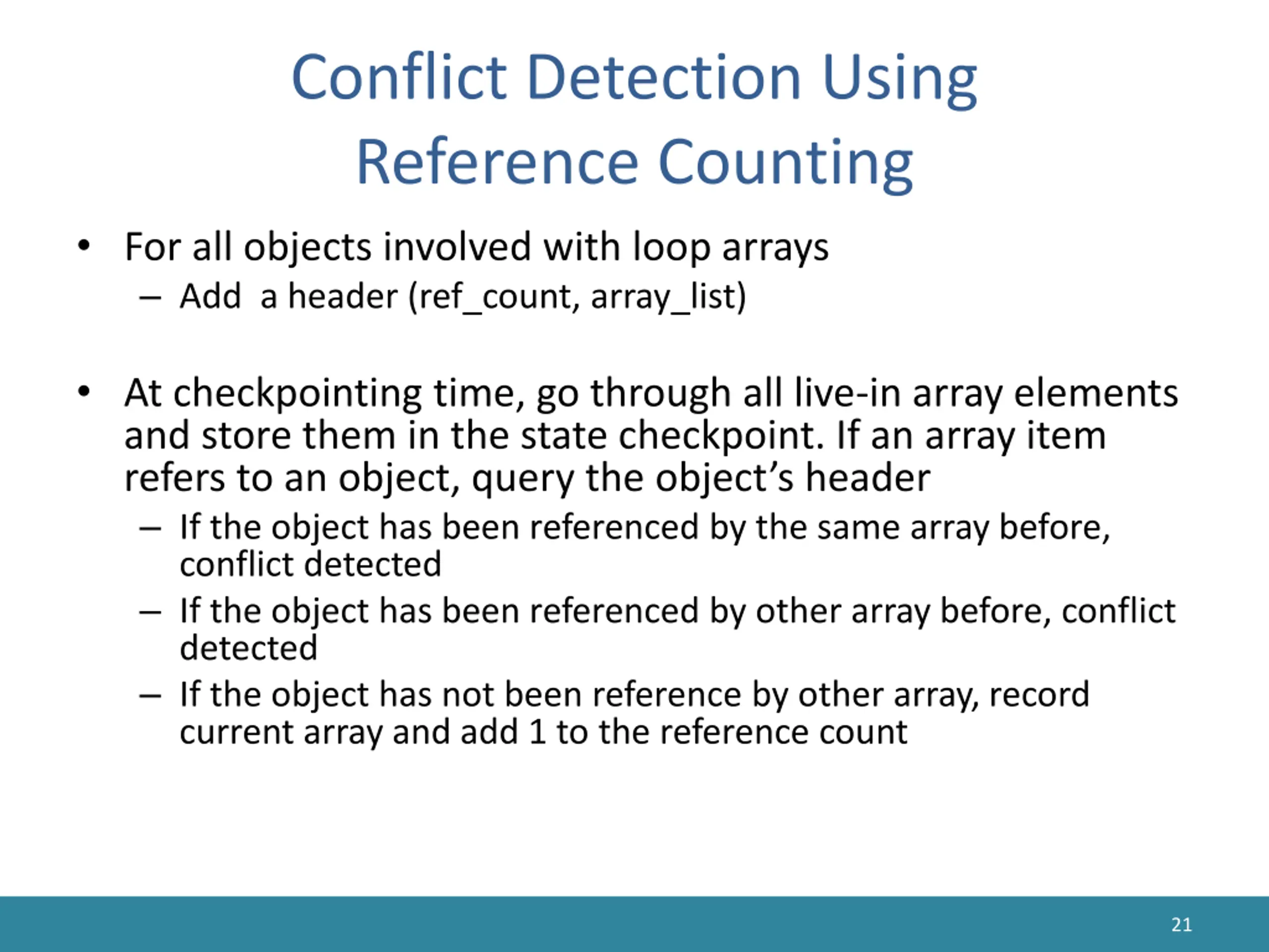 Conflict Detection Using Reference Counting For all objects involved with loop arrays Add a header (ref_count, array_list) At checkpointing time, go through all live-in array elements and store them in the state checkpoint. If an array item refers to an object, query the object s header If the object has been referenced by the same array before, conflict detected If the object has been referenced by other array before, conflict detected If the object has not been reference by other array, record current array and add 1 to the reference count 21