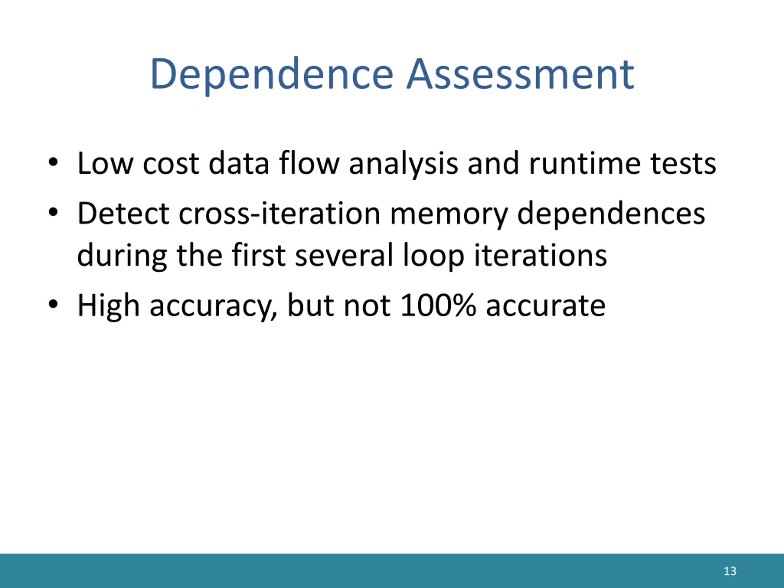 Dependence Assessment Low cost data flow analysis and runtime tests Detect cross-iteration memory dependences during the first several loop iterations High accuracy, but not 100% accurate 13