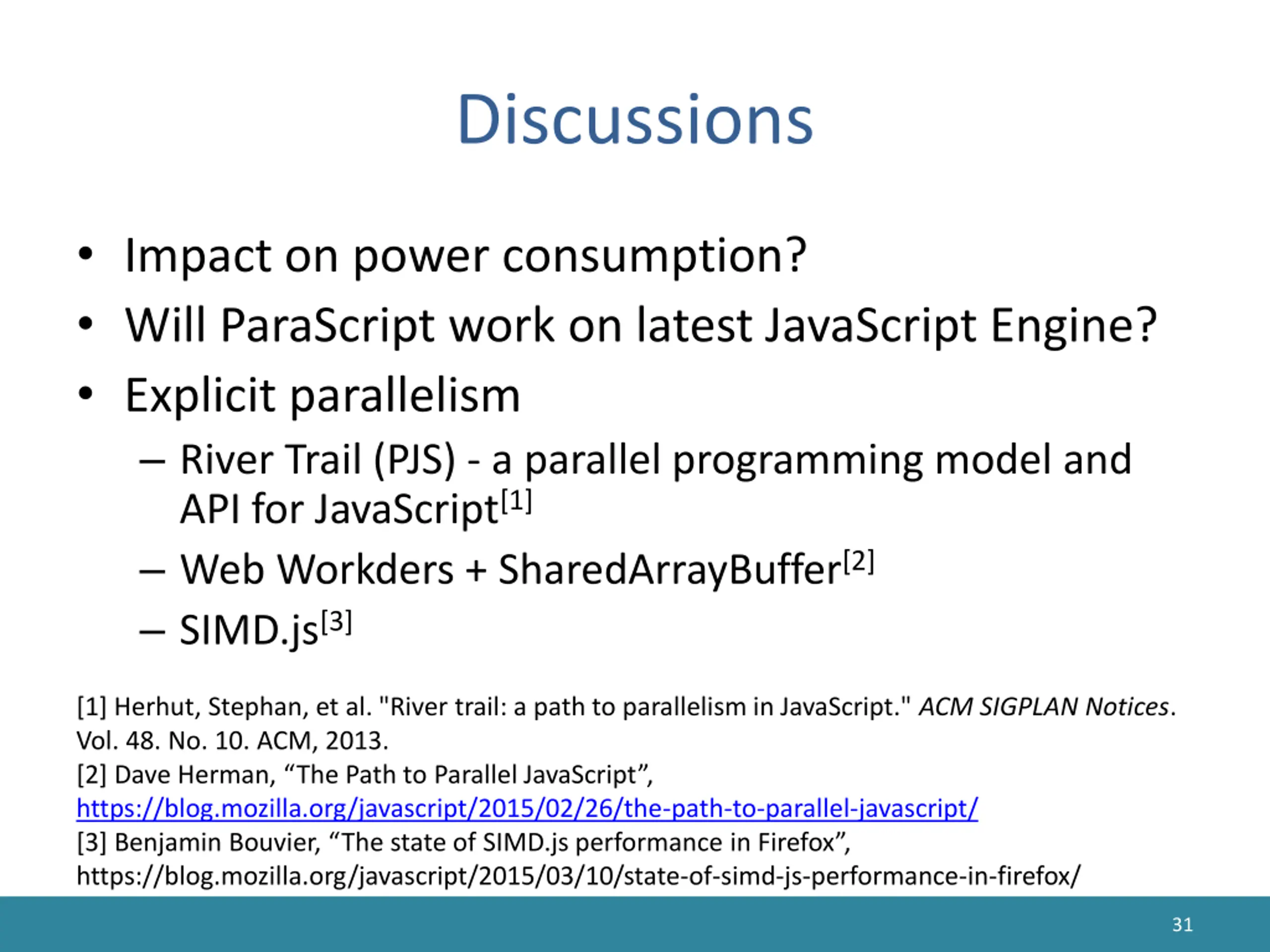 Discussions Impact on power consumption? Will ParaScript work on latest JavaScript Engine? Explicit parallelism River Trail (PJS) - a parallel programming model and API for JavaScript[1] Web Workders + SharedArrayBuffer[2] SIMD.js[3] [1] Herhut, Stephan, et al. "River trail: a path to parallelism in JavaScript." ACM SIGPLAN Notices. Vol. 48. No. 10. ACM, 2013. [2] Dave Herman, The Path to Parallel JavaScript , https://blog.mozilla.org/javascript/2015/02/26/the-path-to-parallel-javascript/ [3] Benjamin Bouvier, The state of SIMD.js performance in Firefox , https://blog.mozilla.org/javascript/2015/03/10/state-of-simd-js-performance-in-firefox/ 31