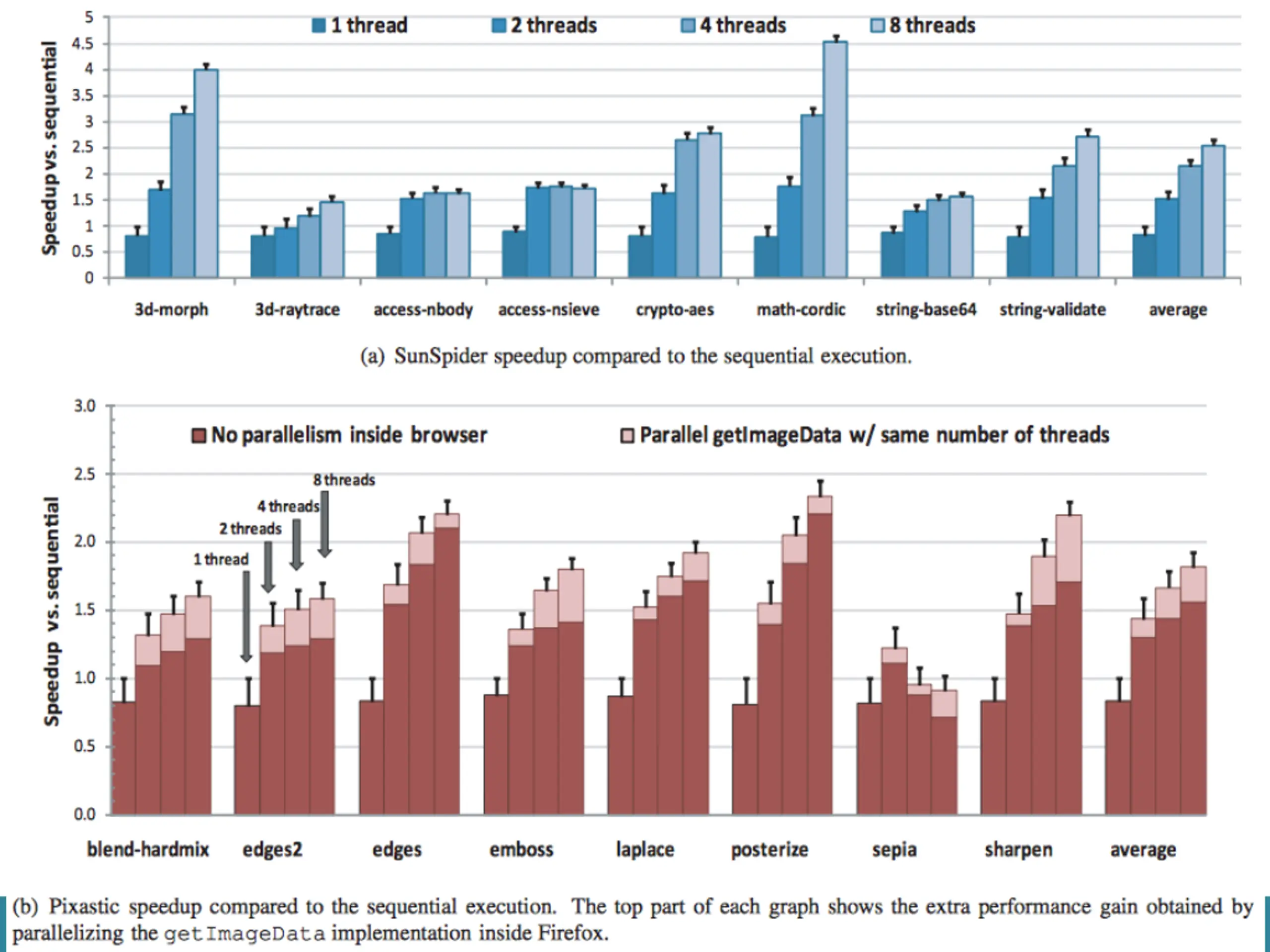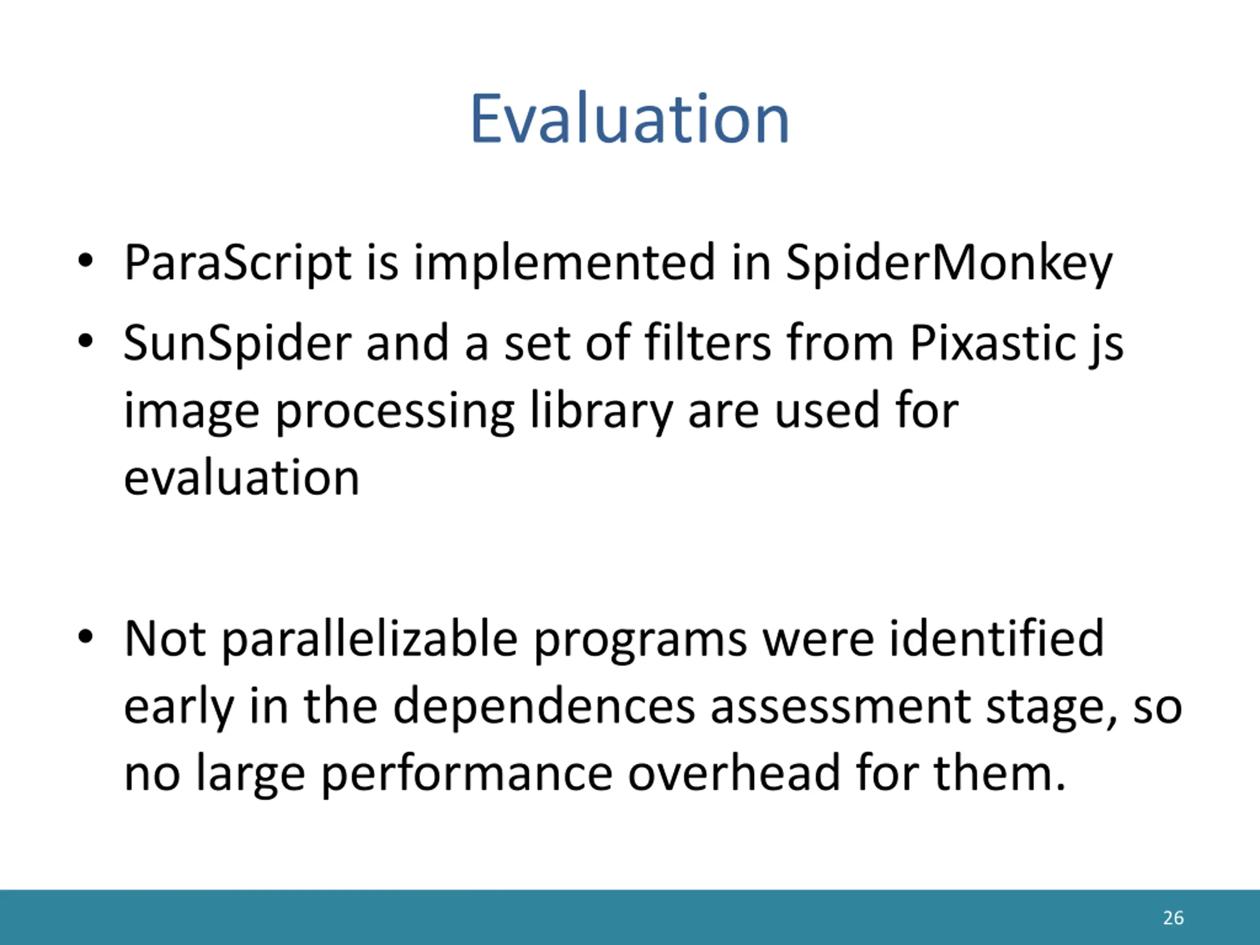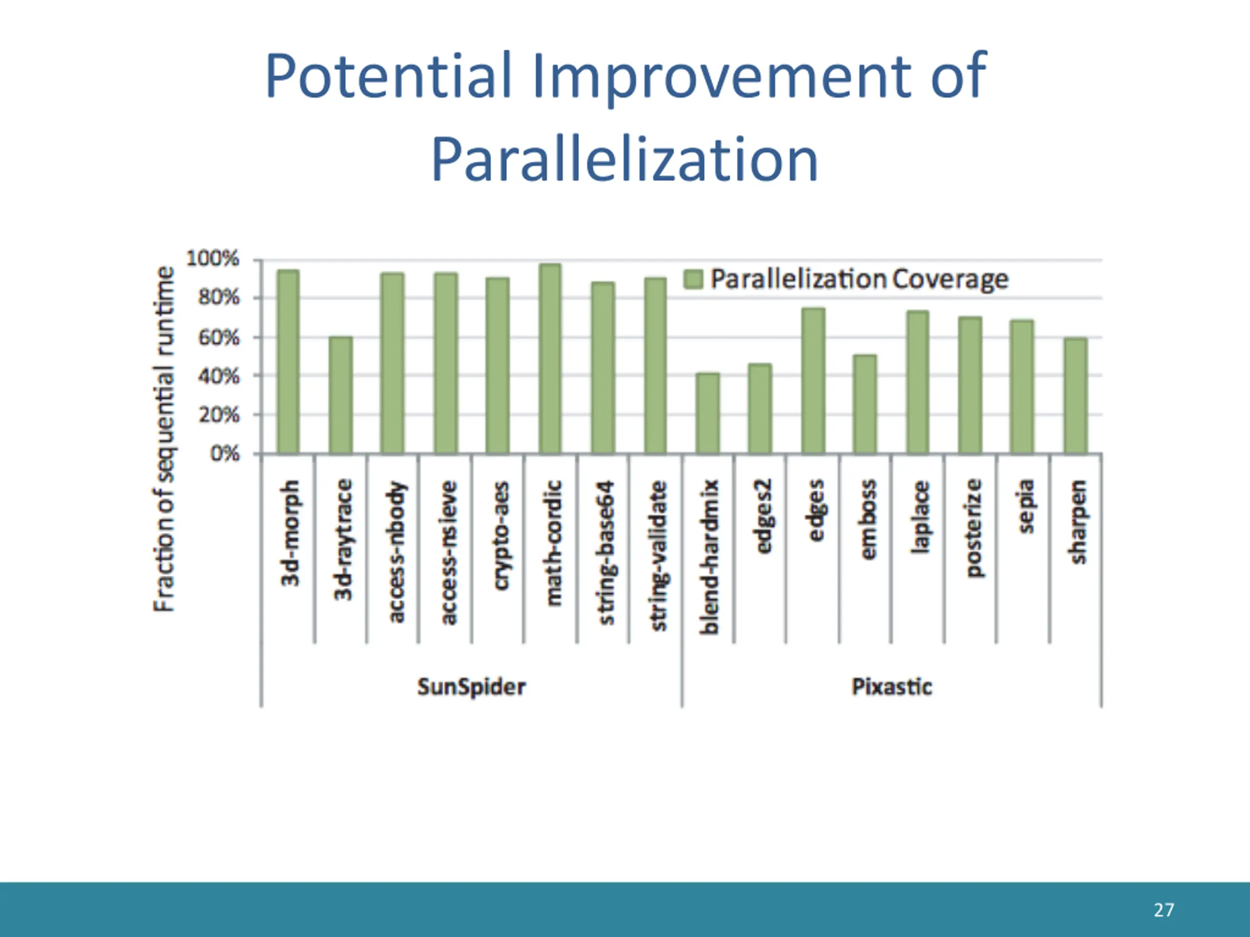 Evaluation ParaScript is implemented in SpiderMonkey SunSpider and a set of filters from Pixastic js image processing library are used for evaluation Not parallelizable programs were identified early in the dependences assessment stage, so no large performance overhead for them. 26