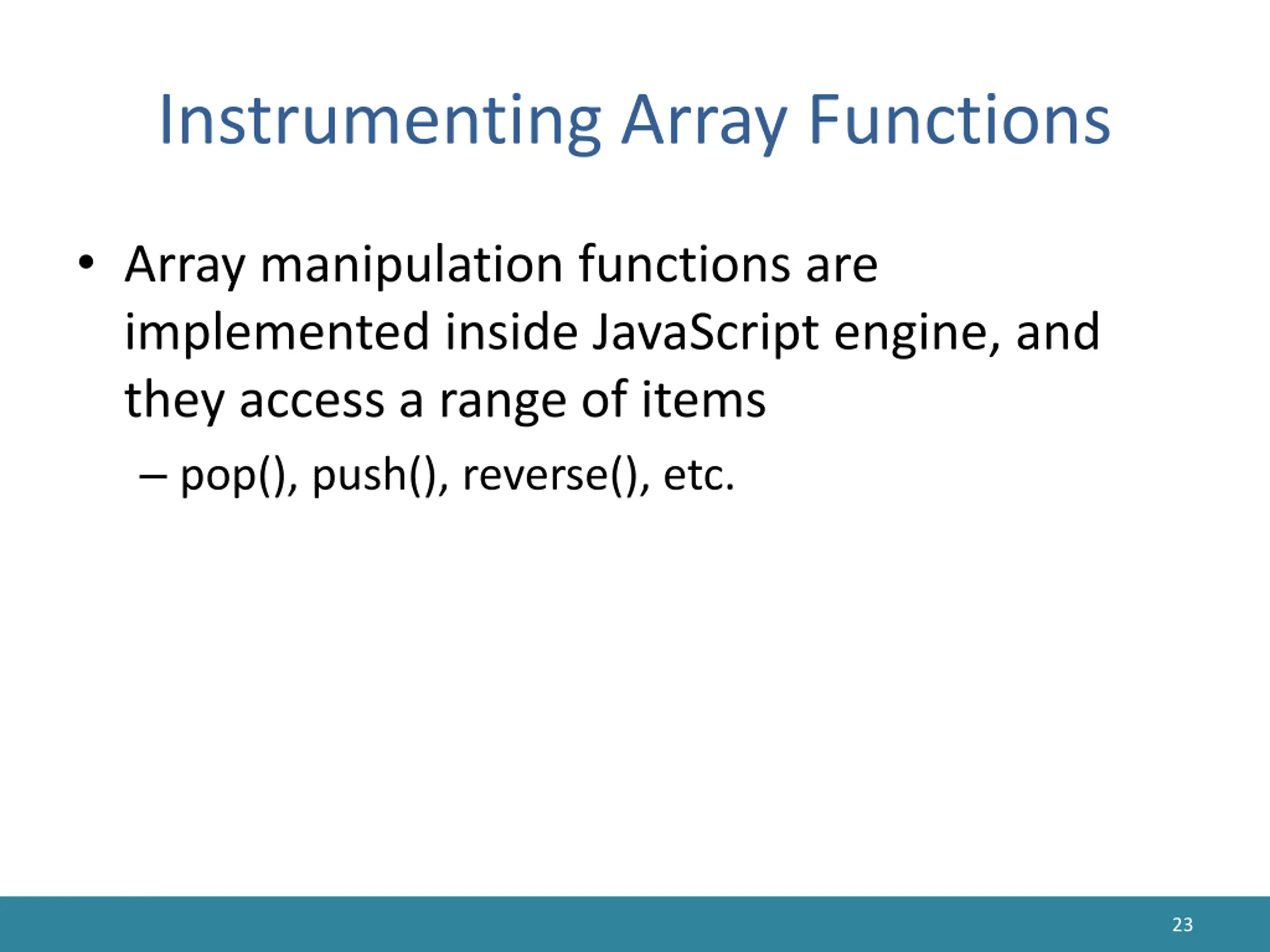 Instrumenting Array Functions Array manipulation functions are implemented inside JavaScript engine, and they access a range of items pop(), push(), reverse(), etc. 23