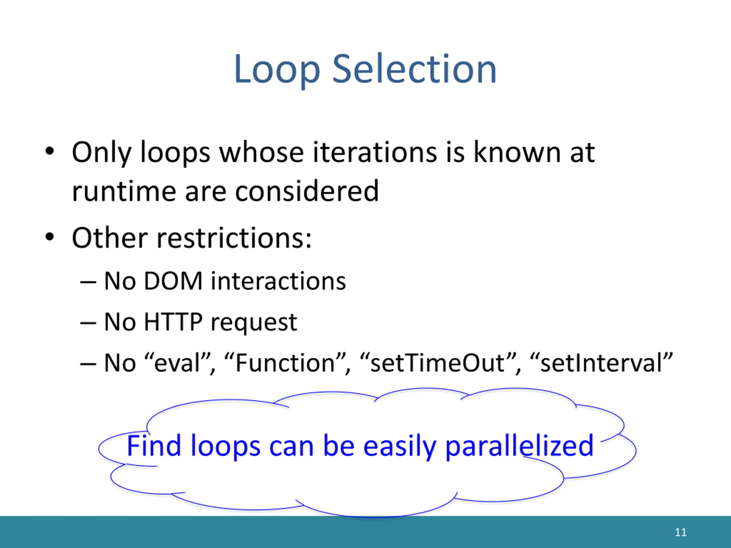 Loop Selection Only loops whose iterations is known at runtime are considered Other restrictions: No DOM interactions No HTTP request No eval , Function , setTimeOut , setInterval Find loops can be easily parallelized 11