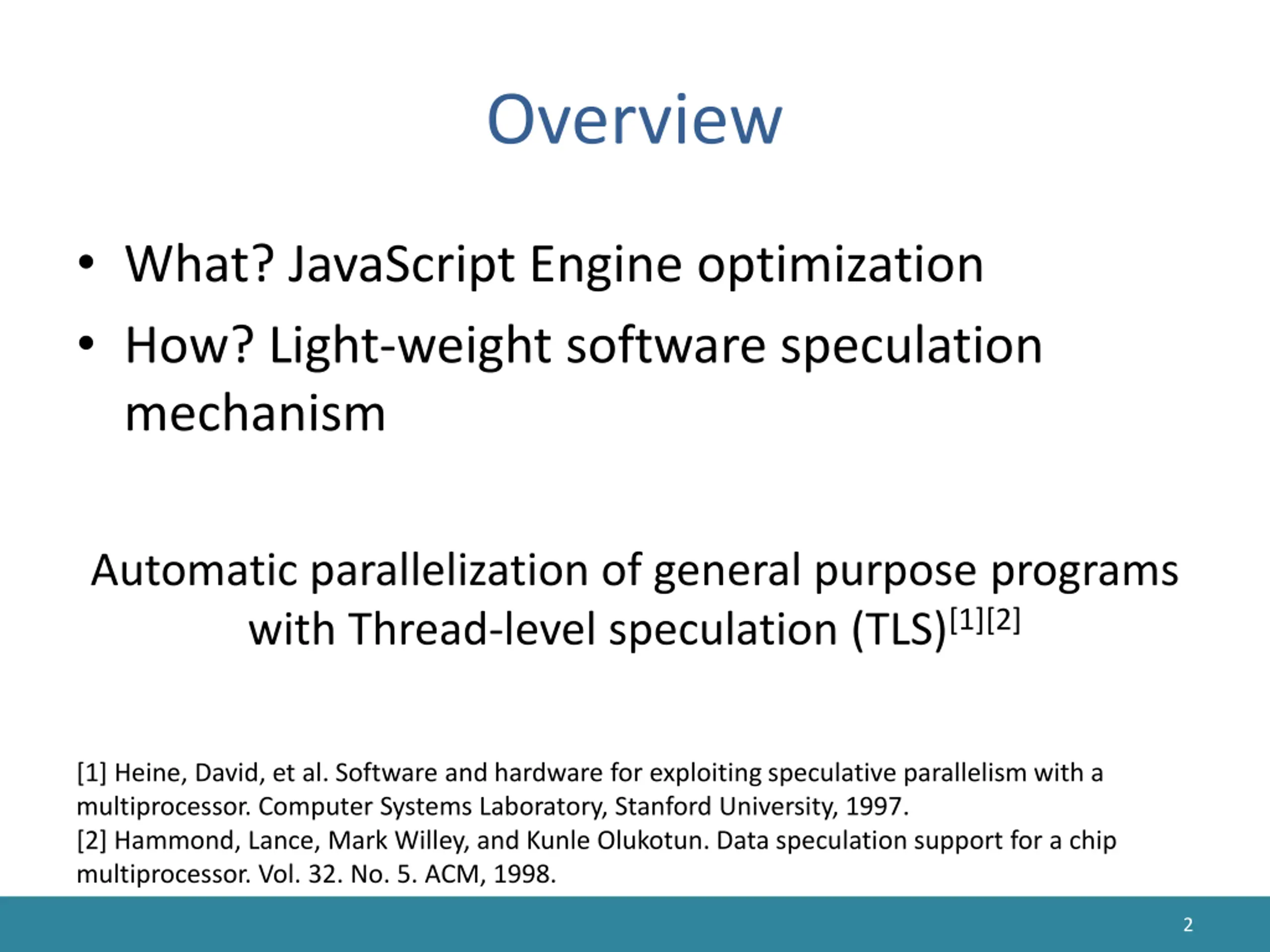 Overview What? JavaScript Engine optimization How? Light-weight software speculation mechanism Automatic parallelization of general purpose programs with Thread-level speculation (TLS)[1][2] [1] Heine, David, et al. Software and hardware for exploiting speculative parallelism with a multiprocessor. Computer Systems Laboratory, Stanford University, 1997. [2] Hammond, Lance, Mark Willey, and Kunle Olukotun. Data speculation support for a chip multiprocessor. Vol. 32. No. 5. ACM, 1998. 2