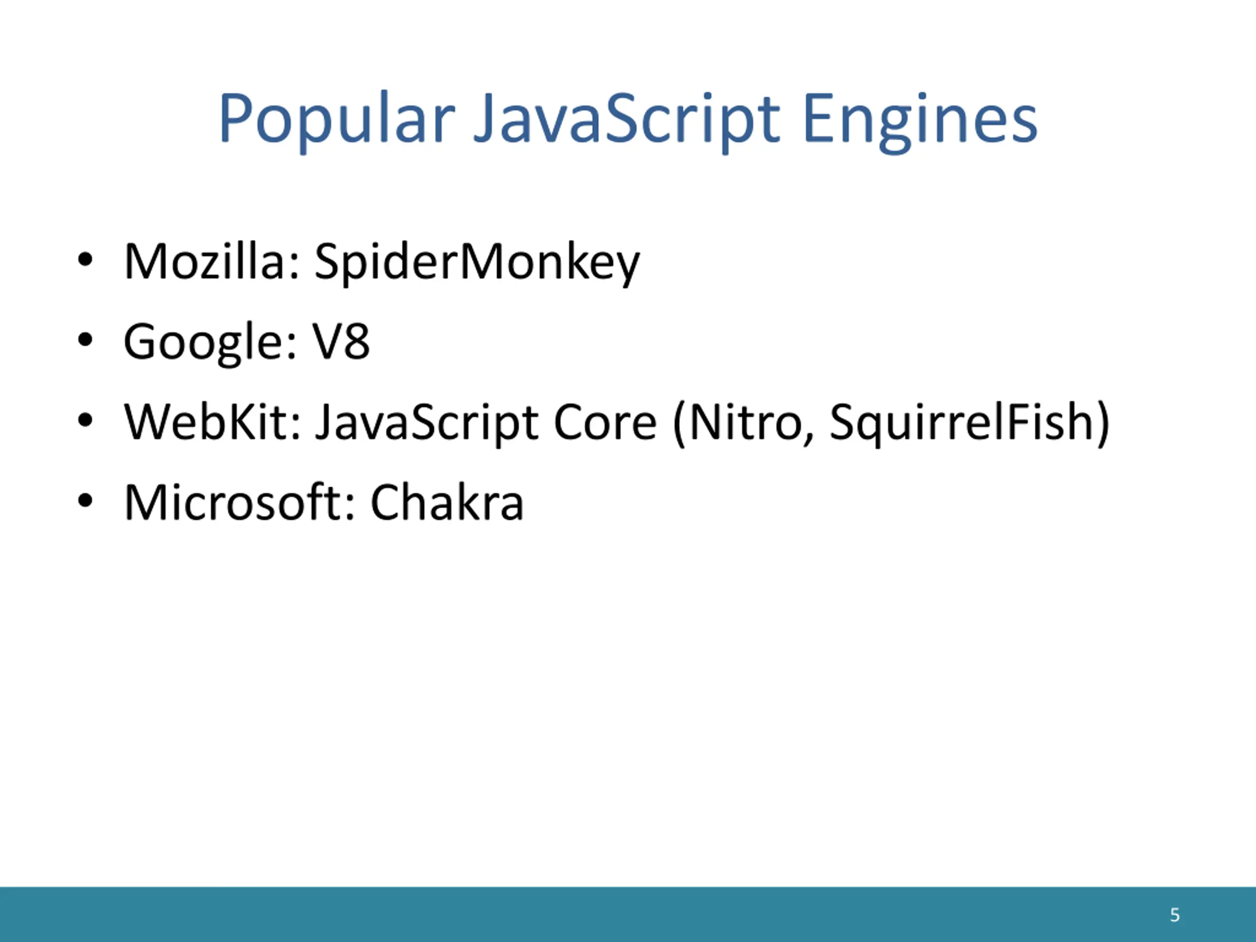 Popular JavaScript Engines Mozilla: SpiderMonkey Google: V8 WebKit: JavaScript Core (Nitro, SquirrelFish) Microsoft: Chakra 5
