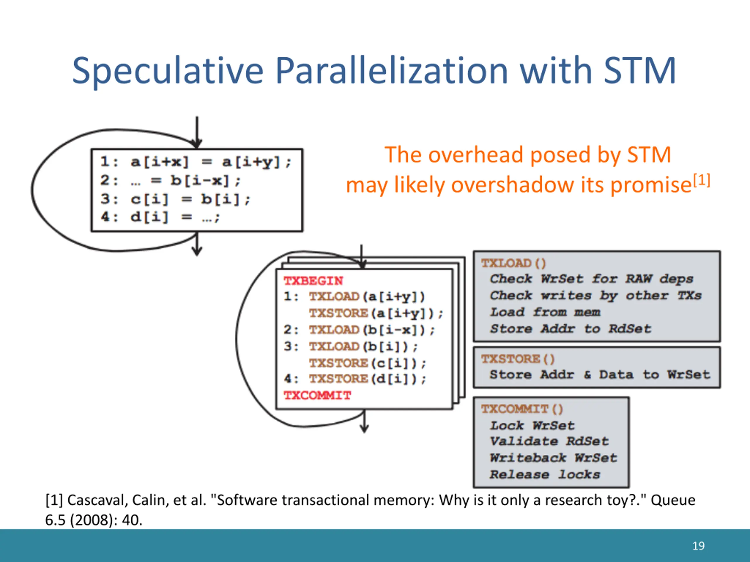 Speculative Parallelization with STM The overhead posed by STM may likely overshadow its promise[1] [1] Cascaval, Calin, et al. "Software transactional memory: Why is it only a research toy?." Queue 6.5 (2008): 40. 19