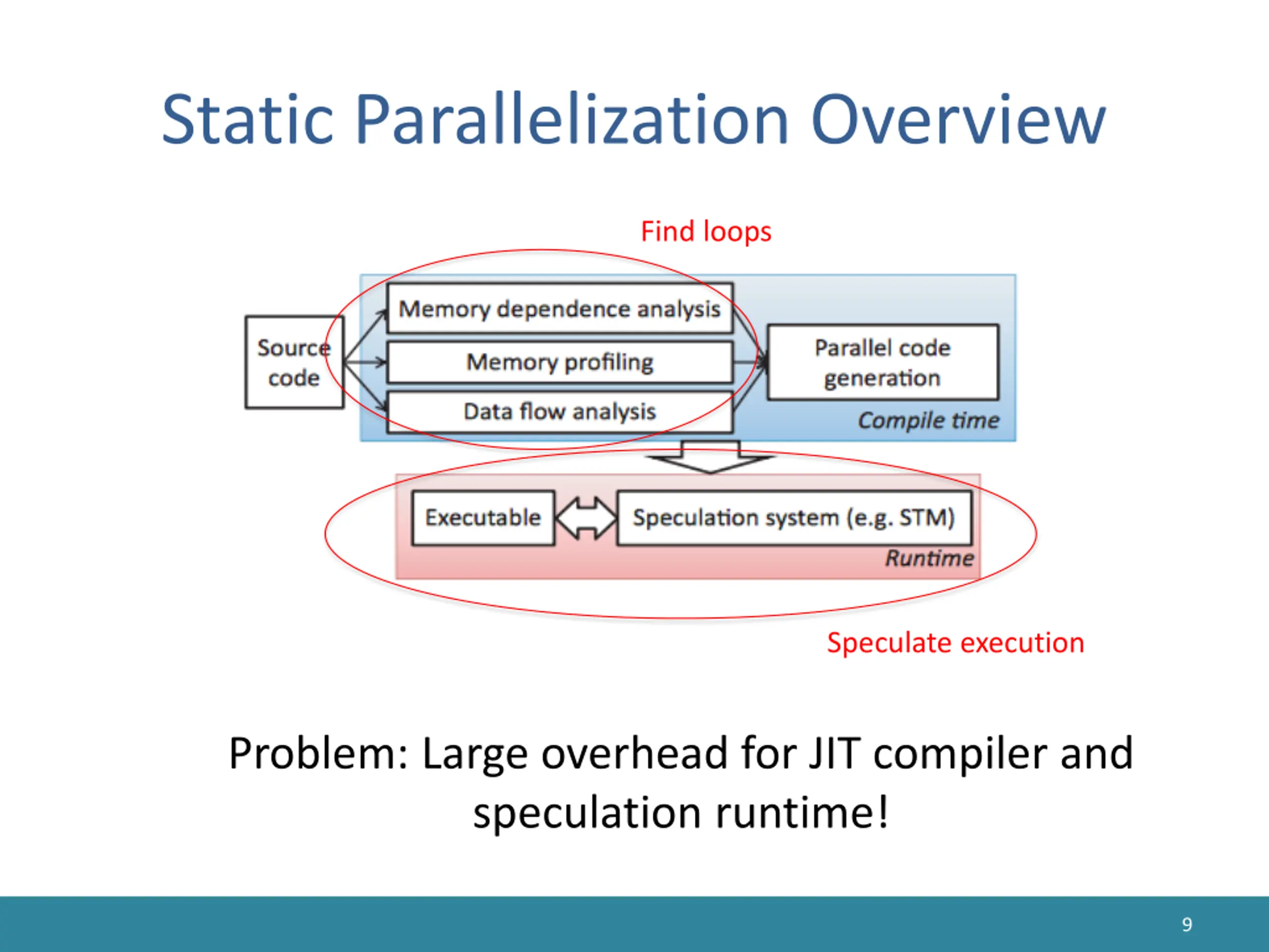 Static Parallelization Overview Find loops Speculate execution Problem: Large overhead for JIT compiler and speculation runtime! 9