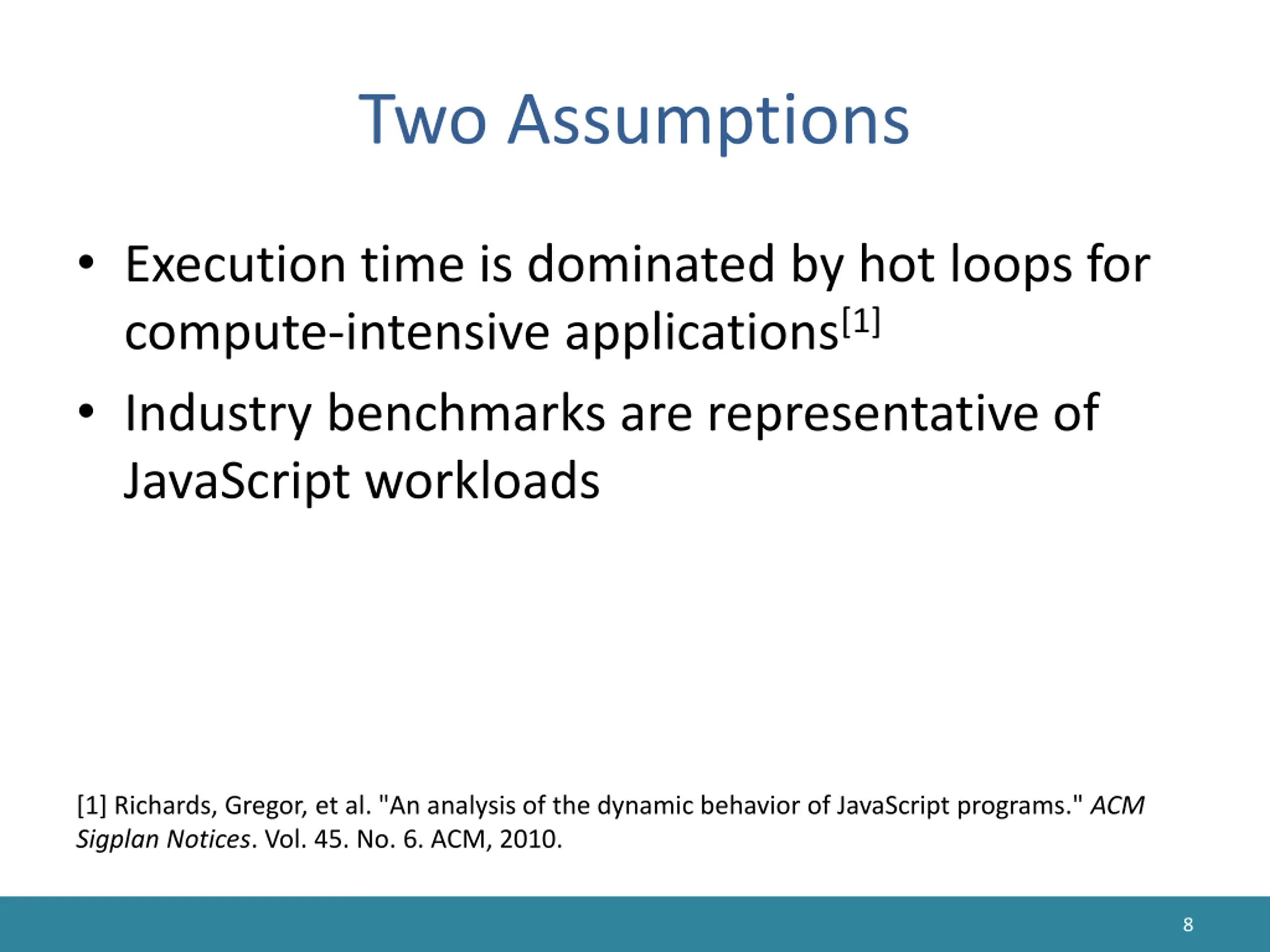 Two Assumptions Execution time is dominated by hot loops for compute-intensive applications[1] Industry benchmarks are representative of JavaScript workloads [1] Richards, Gregor, et al. "An analysis of the dynamic behavior of JavaScript programs." ACM Sigplan Notices. Vol. 45. No. 6. ACM, 2010. 8