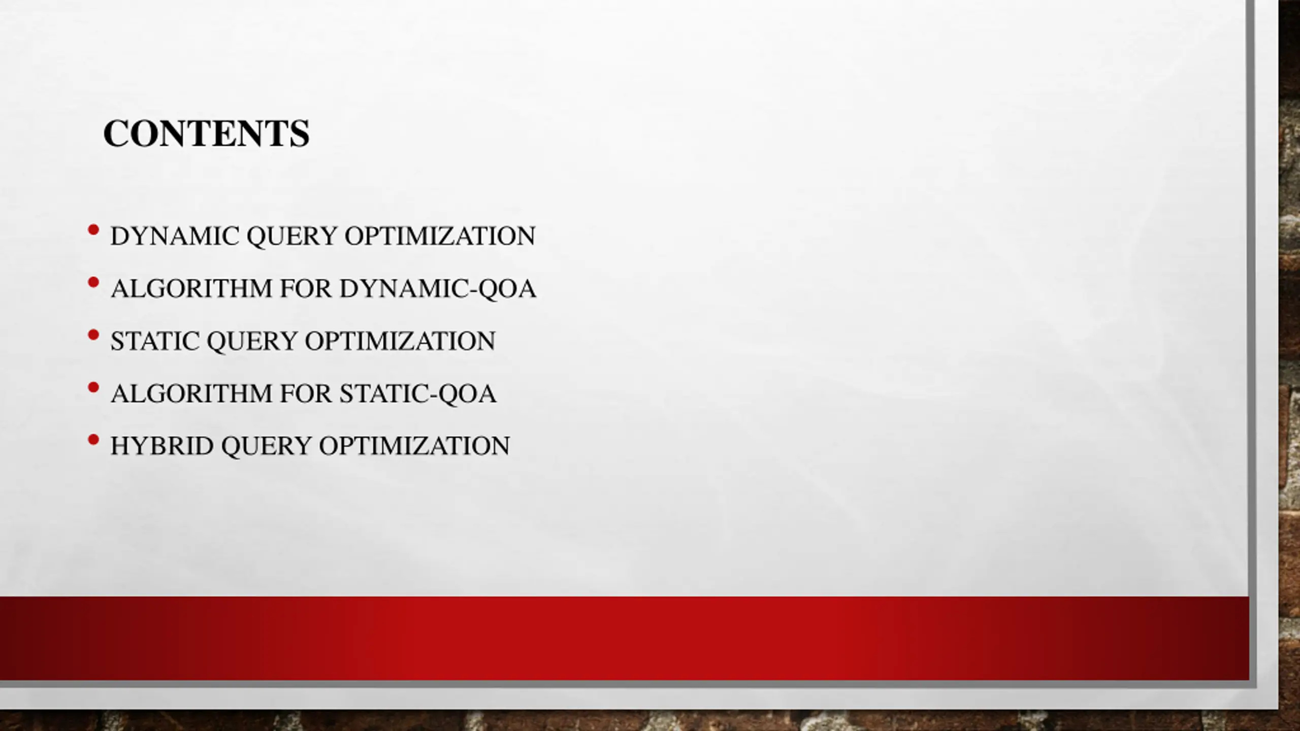 CONTENTS DYNAMIC QUERY OPTIMIZATION ALGORITHM FOR DYNAMIC-QOA STATIC QUERY OPTIMIZATION ALGORITHM FOR STATIC-QOA HYBRID QUERY OPTIMIZATION