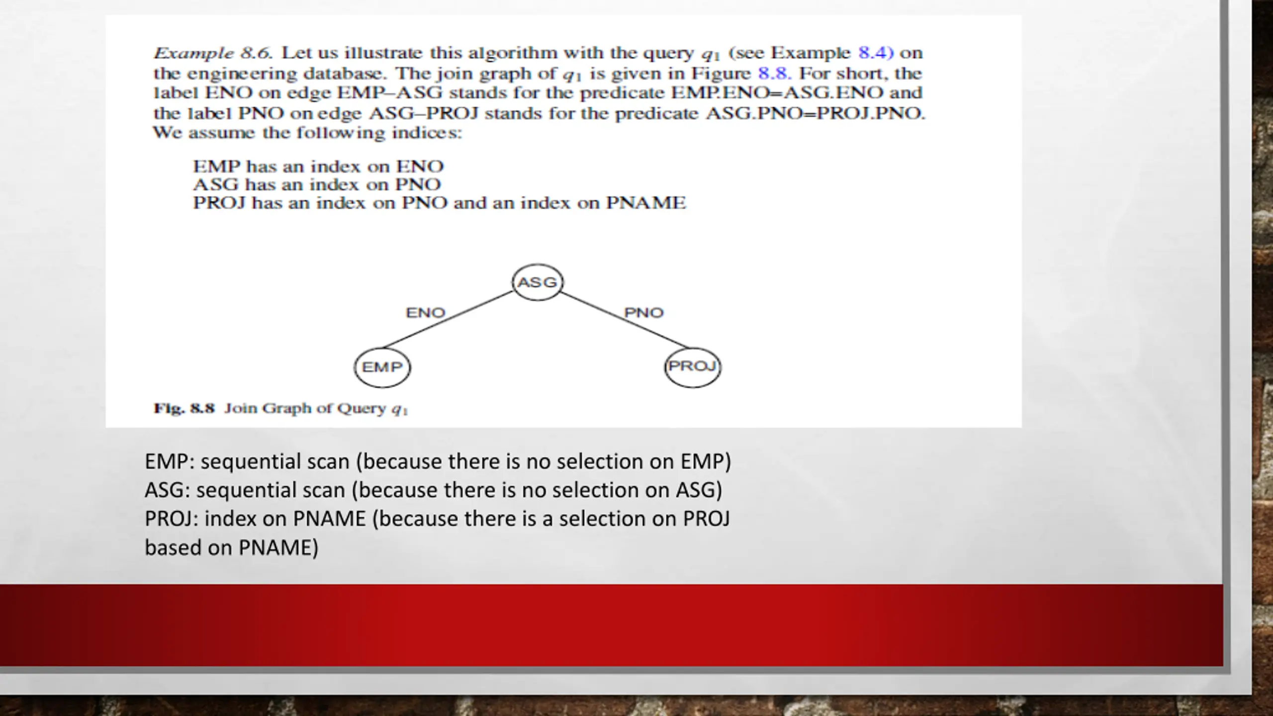 EMP: sequential scan (because there is no selection on EMP) ASG: sequential scan (because there is no selection on ASG) PROJ: index on PNAME (because there is a selection on PROJ based on PNAME)