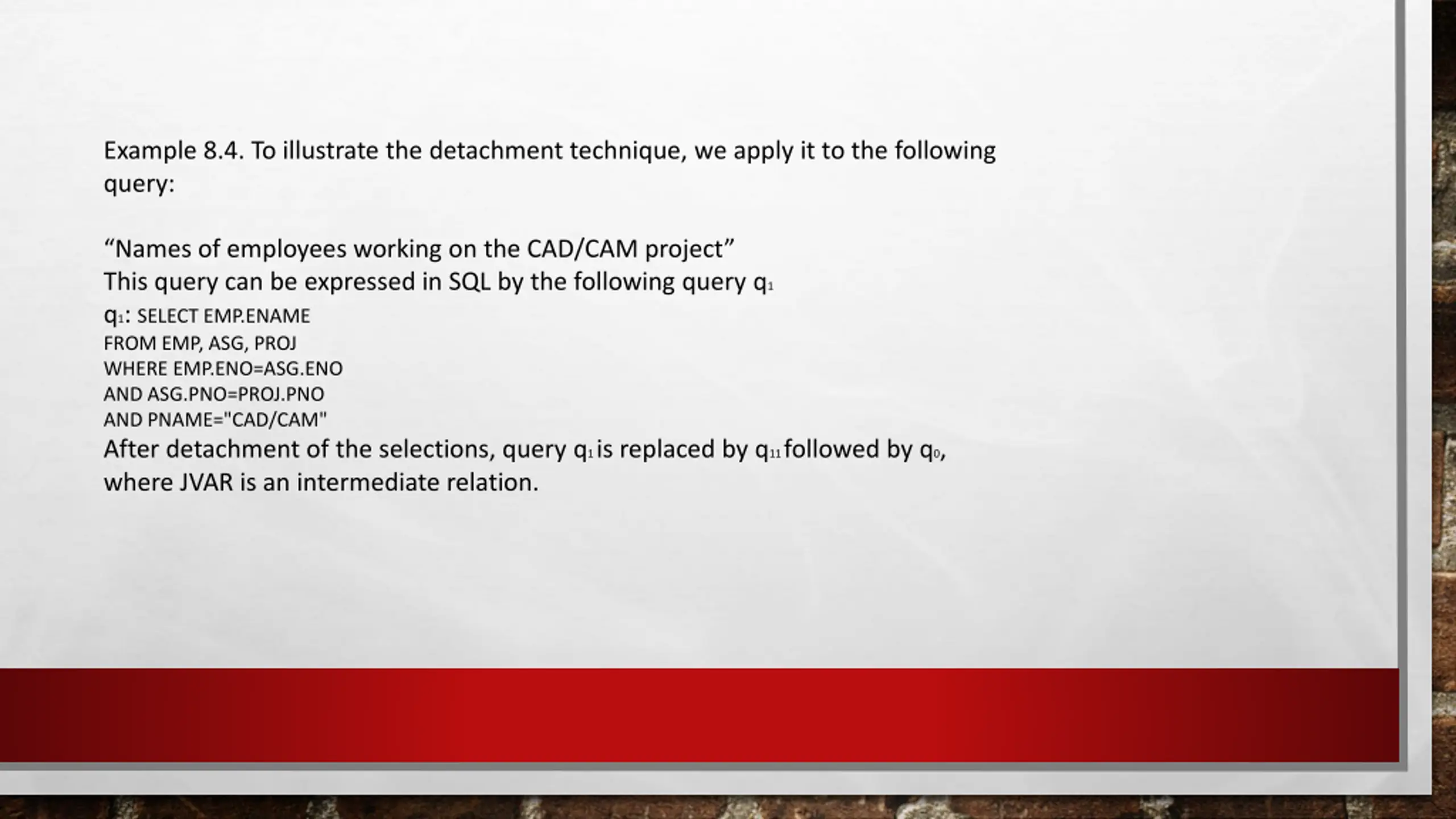 Example 8.4. To illustrate the detachment technique, we apply it to the following query: Names of employees working on the CAD/CAM project This query can be expressed in SQL by the following query q1 q1: SELECT EMP.ENAME FROM EMP, ASG, PROJ WHERE EMP.ENO=ASG.ENO AND ASG.PNO=PROJ.PNO AND PNAME="CAD/CAM" After detachment of the selections, query q1 is replaced by q11 followed by q0, where JVAR is an intermediate relation.