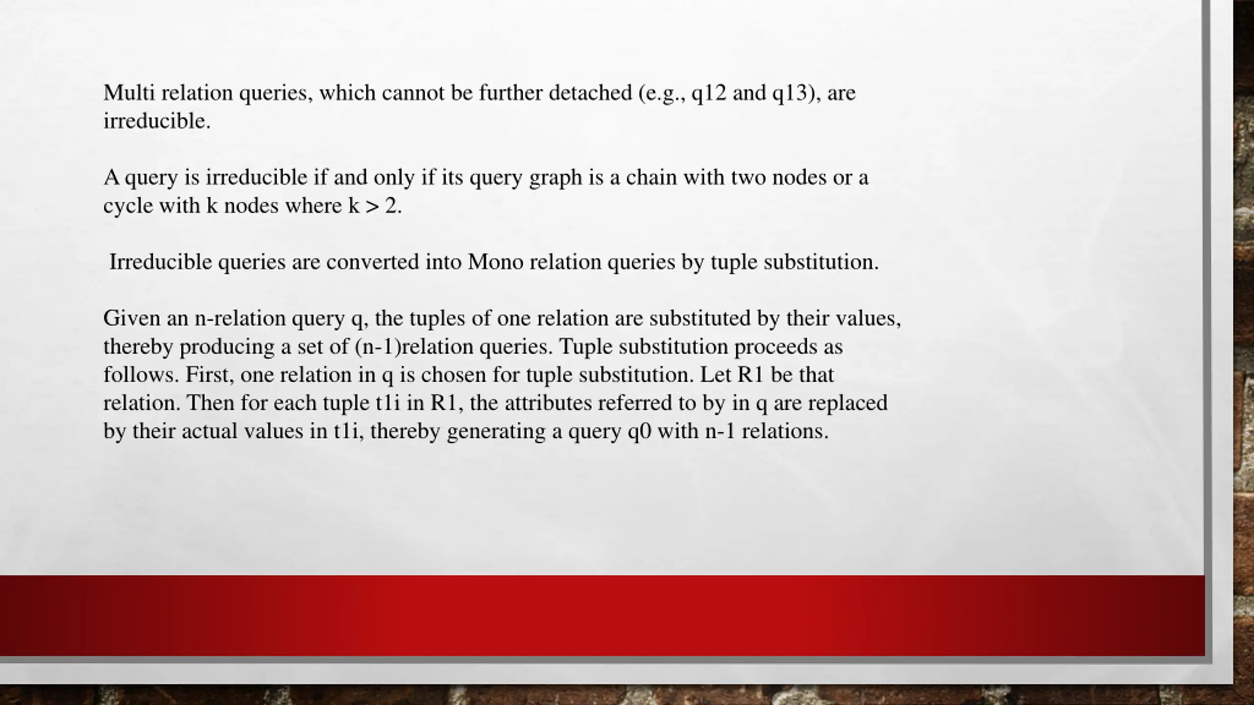 QUERY Q11 IS MONO RELATION AND CAN BE EXECUTED. HOWEVER, Q12 AND Q13 ARE NOT MONO RELATION AND CANNOT BE REDUCED BY DETACHMENT. MULTI RELATION QUERIES, WHICH CANNOT BE FURTHER DETACHED (E.G., Q12 AND Q13), ARE IRREDUCIBLE. A QUERY IS IRREDUCIBLE IF AND ONLY IF ITS QUERY GRAPH IS A CHAIN WITH TWO NODES OR A CYCLE WITH K NODES WHERE K > 2. IRREDUCIBLE QUERIES ARE CONVERTED INTO MONO RELATION QUERIES BY TUPLE SUBSTITUTION.