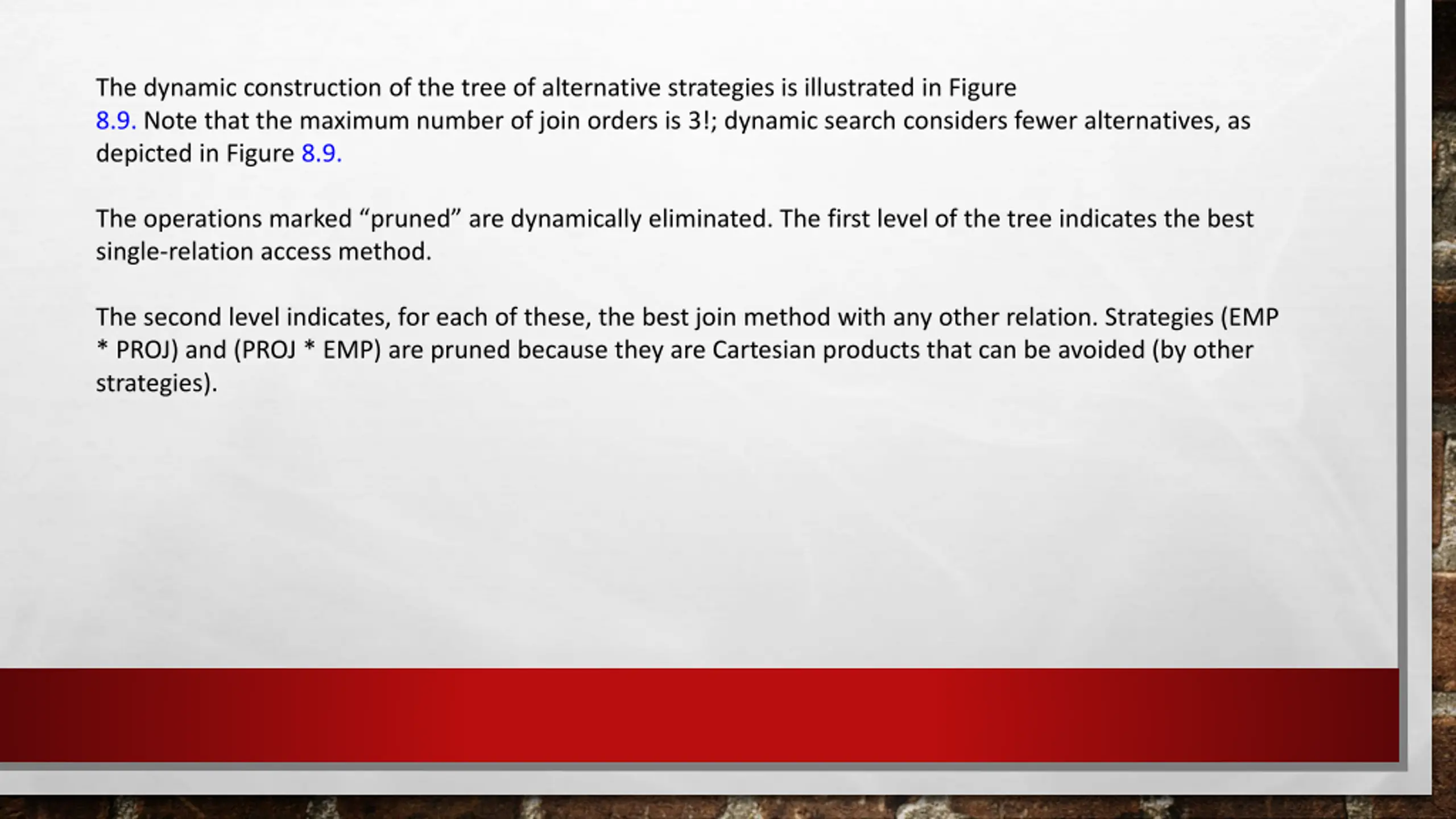The dynamic construction of the tree of alternative strategies is illustrated in Figure 8.9. Note that the maximum number of join orders is 3!; dynamic search considers fewer alternatives, as depicted in Figure 8.9. The operations marked pruned are dynamically eliminated. The first level of the tree indicates the best single-relation access method. The second level indicates, for each of these, the best join method with any other relation. Strategies (EMP * PROJ) and (PROJ * EMP) are pruned because they are Cartesian products that can be avoided (by other strategies).