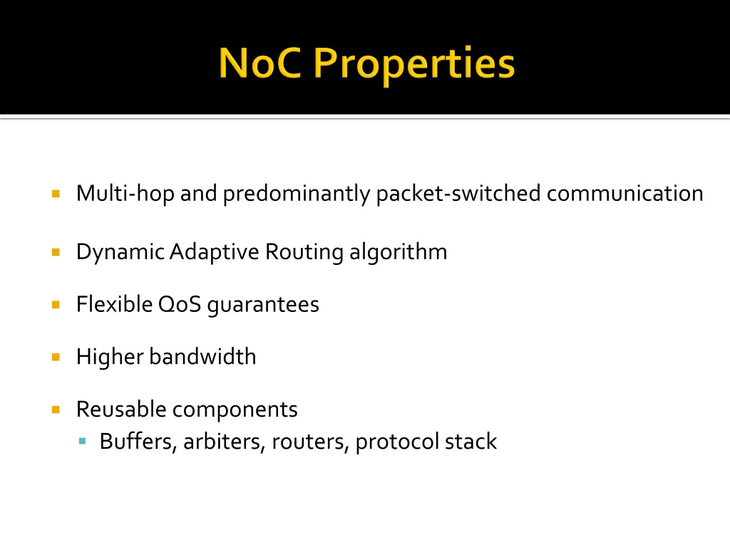 Multi-hop and predominantly packet-switched communication Dynamic Adaptive Routing algorithm Flexible QoS guarantees Higher bandwidth Reusable components Buffers, arbiters, routers, protocol stack