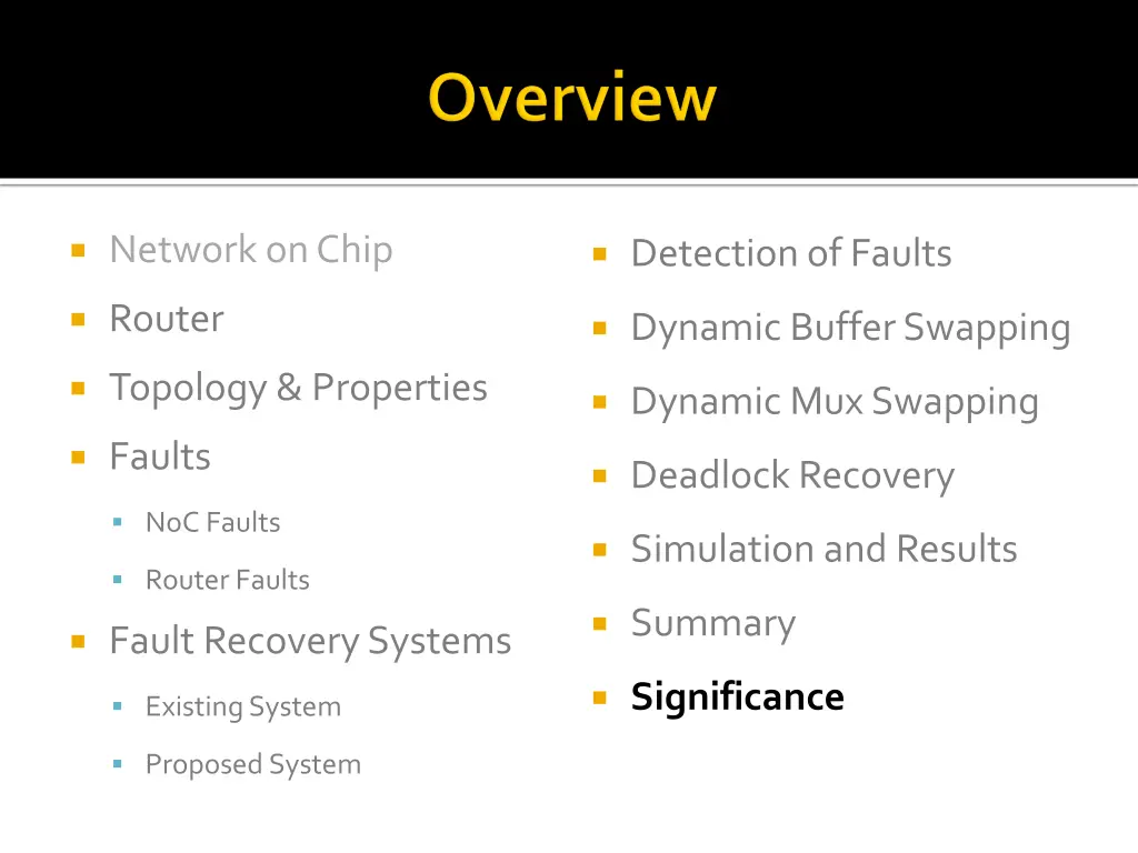 Network on Chip Detection of Faults Router Dynamic Buffer Topology & Properties Swapping Faults Dynamic Mux Swapping NoC Faults Deadlock Recovery Router Faults Simulation and Results Fault Recovery Systems Summary Existing System Proposed System Significance