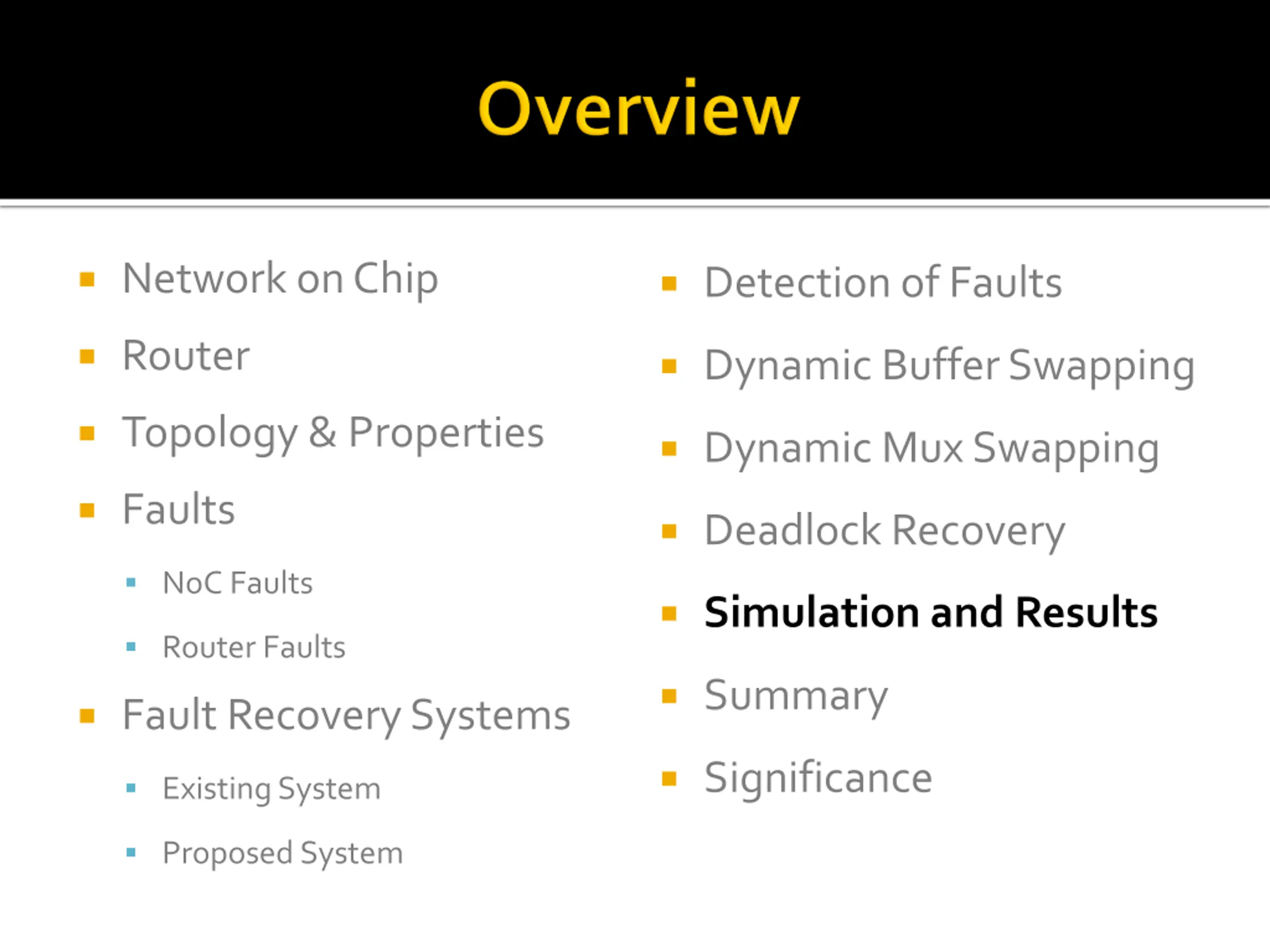 Network on Chip Detection of Faults Router Dynamic Buffer Swapping Topology & Properties Dynamic Mux Swapping Faults Deadlock Recovery NoC Faults Simulation and Results Router Faults Summary Fault Recovery Systems Significance Existing System Proposed System