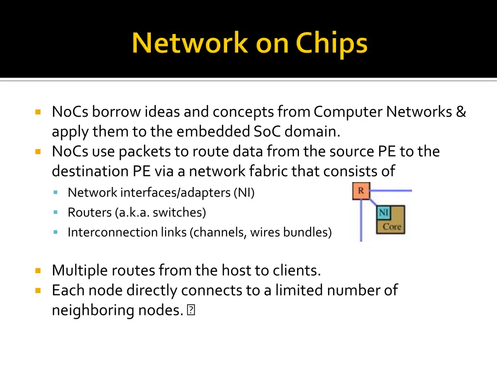 NoCs borrow ideas and concepts from Computer Networks & apply them to the embedded SoC domain. NoCs use packets to route data from the source PE to the destination PE via a network fabric that consists of Network interfaces/adapters (NI) Routers (a.k.a. switches) Interconnection links (channels, wires bundles) Multiple routes from the host to clients. Each node directly connects to a limited number of neighboring nodes.