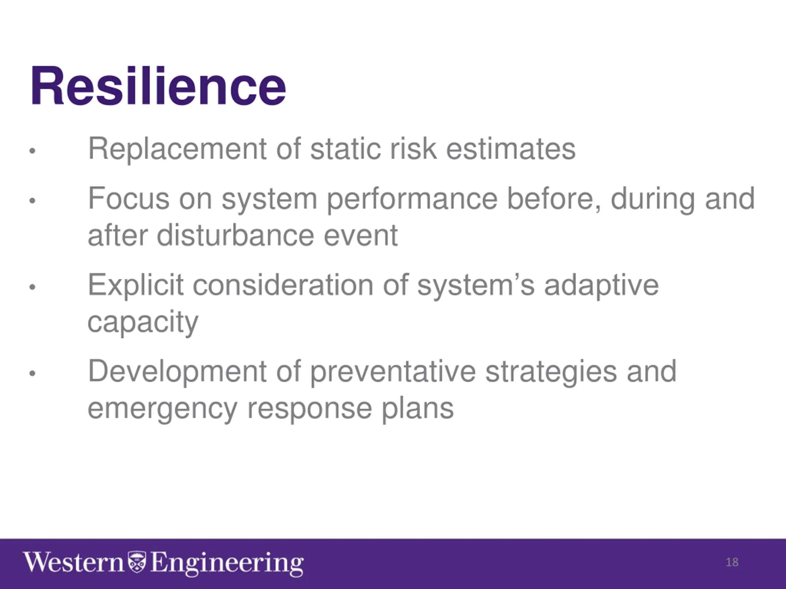 Resilience Replacement of static risk estimates Focus on system performance before, during and after disturbance event Explicit consideration of system s adaptive capacity Development of preventative strategies and emergency response plans 18