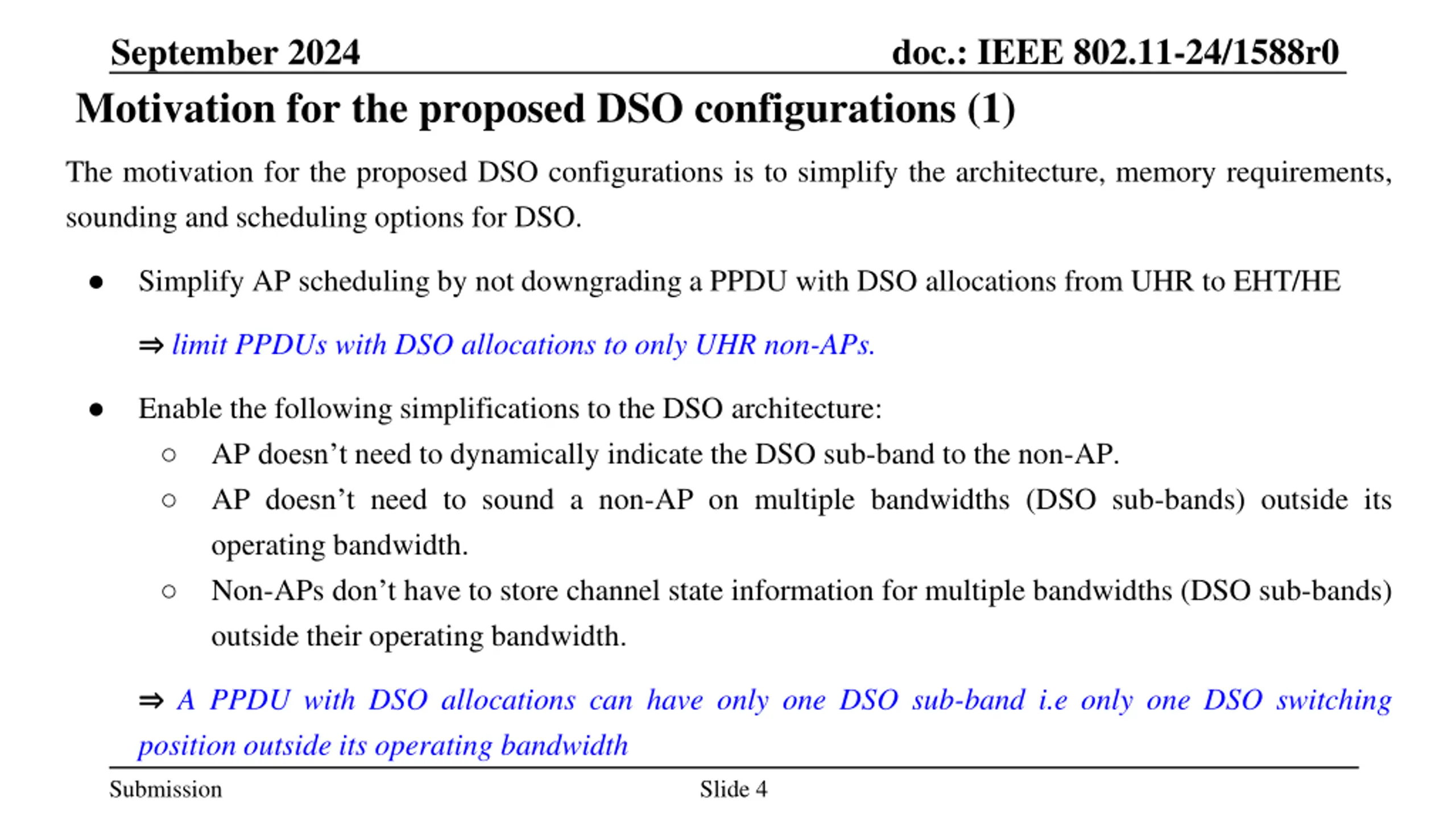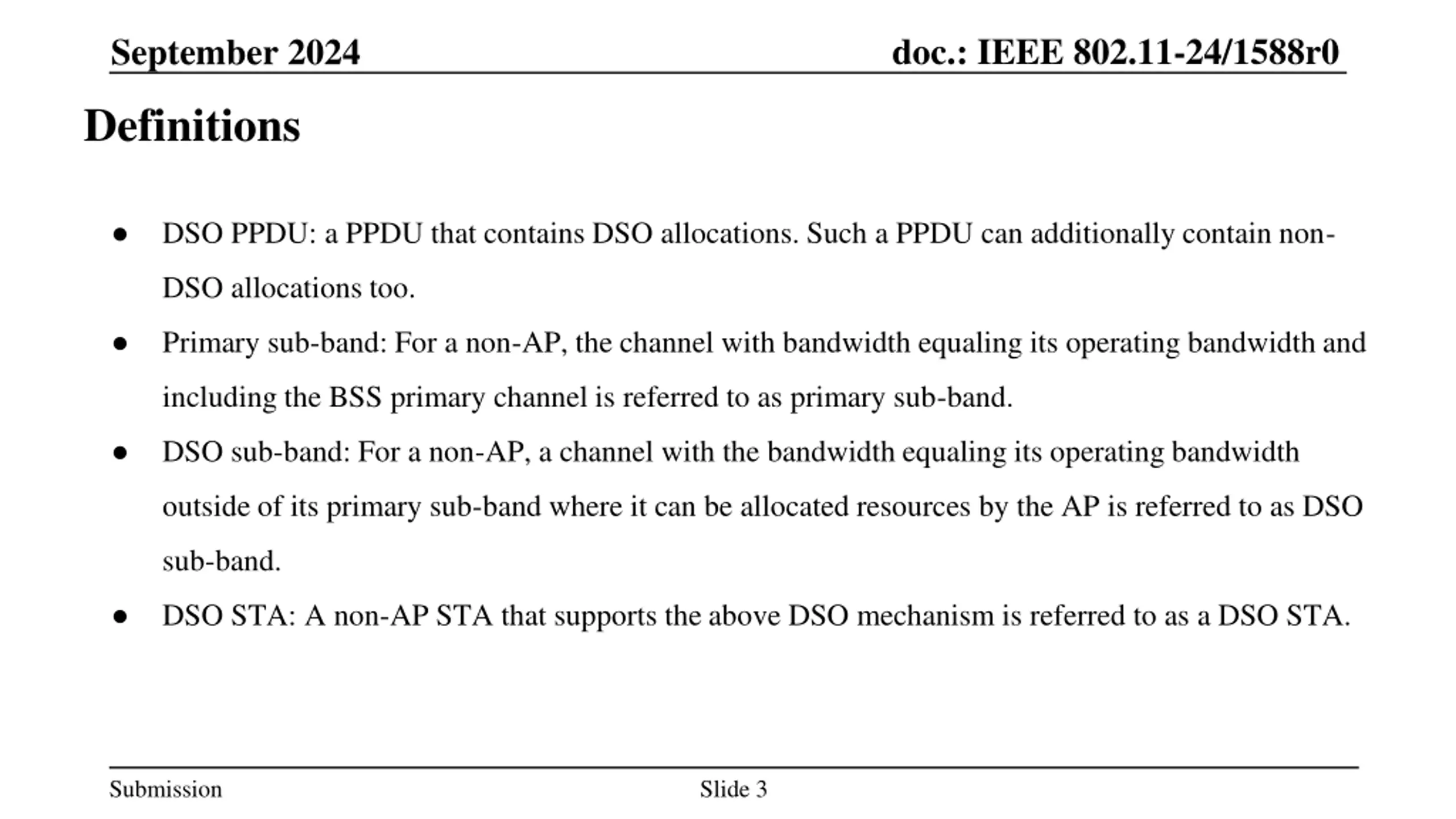 doc.: IEEE 802.11-24/1588r0 September 2024 Definitions DSO PPDU: a PPDU that contains DSO allocations. Such a PPDU can additionally contain non- DSO allocations too. Primary sub-band: For a non-AP, the channel with bandwidth equaling its operating bandwidth and including the BSS primary channel is referred to as primary sub-band. DSO sub-band: For a non-AP, a channel with the bandwidth equaling its operating bandwidth outside of its primary sub-band where it can be allocated resources by the AP is referred to as DSO sub-band. DSO STA: A non-AP STA that supports the above DSO mechanism is referred to as a DSO STA. Submission Slide 3