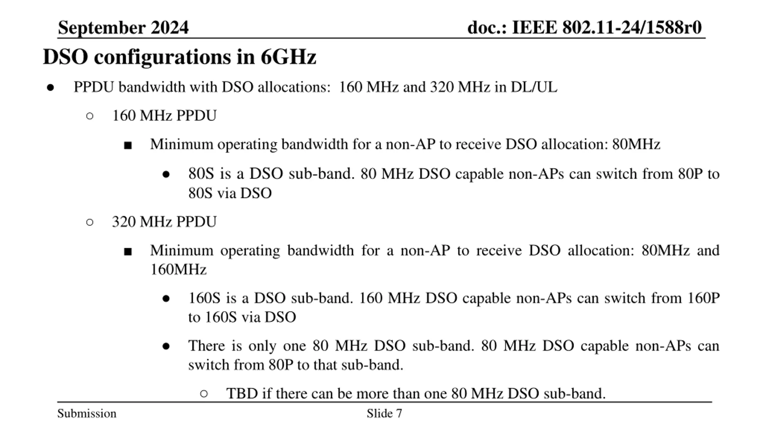 doc.: IEEE 802.11-24/1588r0 September 2024 DSO configurations in 5GHz PPDU bandwidth with DSO allocations: 160 MHz in DL/UL Minimum operating bandwidth for a non-AP to receive DSO allocation: 80 MHz 80S is a DSO sub-band 80 MHz DSO capable non-APs can switch from 80P to 80S via DSO Submission Slide 6