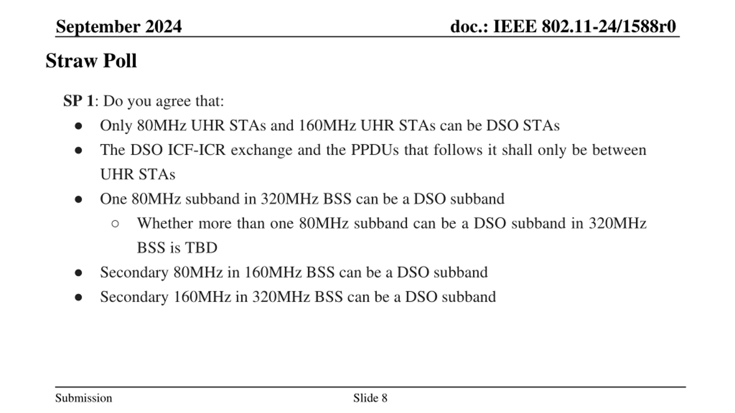 doc.: IEEE 802.11-24/1588r0 September 2024 Straw Poll SP 1: Do you agree that: Only 80MHz UHR STAs and 160MHz UHR STAs can be DSO STAs The DSO ICF-ICR exchange and the PPDUs that follows it shall only be between UHR STAs One 80MHz subband in 320MHz BSS can be a DSO subband Whether more than one 80MHz subband can be a DSO subband in 320MHz BSS is TBD Secondary 80MHz in 160MHz BSS can be a DSO subband Secondary 160MHz in 320MHz BSS can be a DSO subband Submission Slide 8