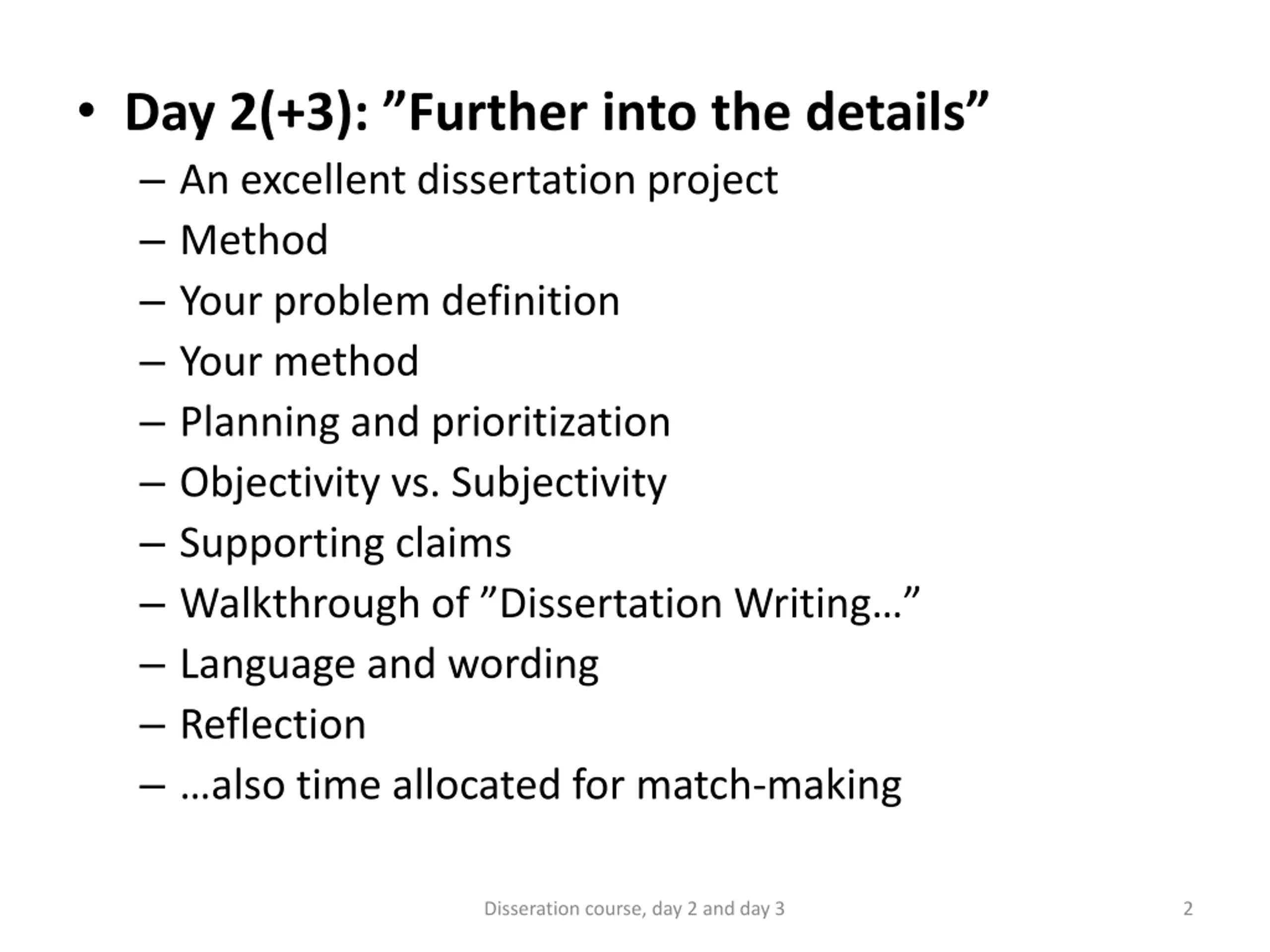 Day 2(+3): Further into the details An excellent dissertation project Method Your problem definition Your method Planning and prioritization Objectivity vs. Subjectivity Supporting claims Walkthrough of Dissertation Writing Language and wording Reflection also time allocated for match-making Disseration course, day 2 and day 3 2