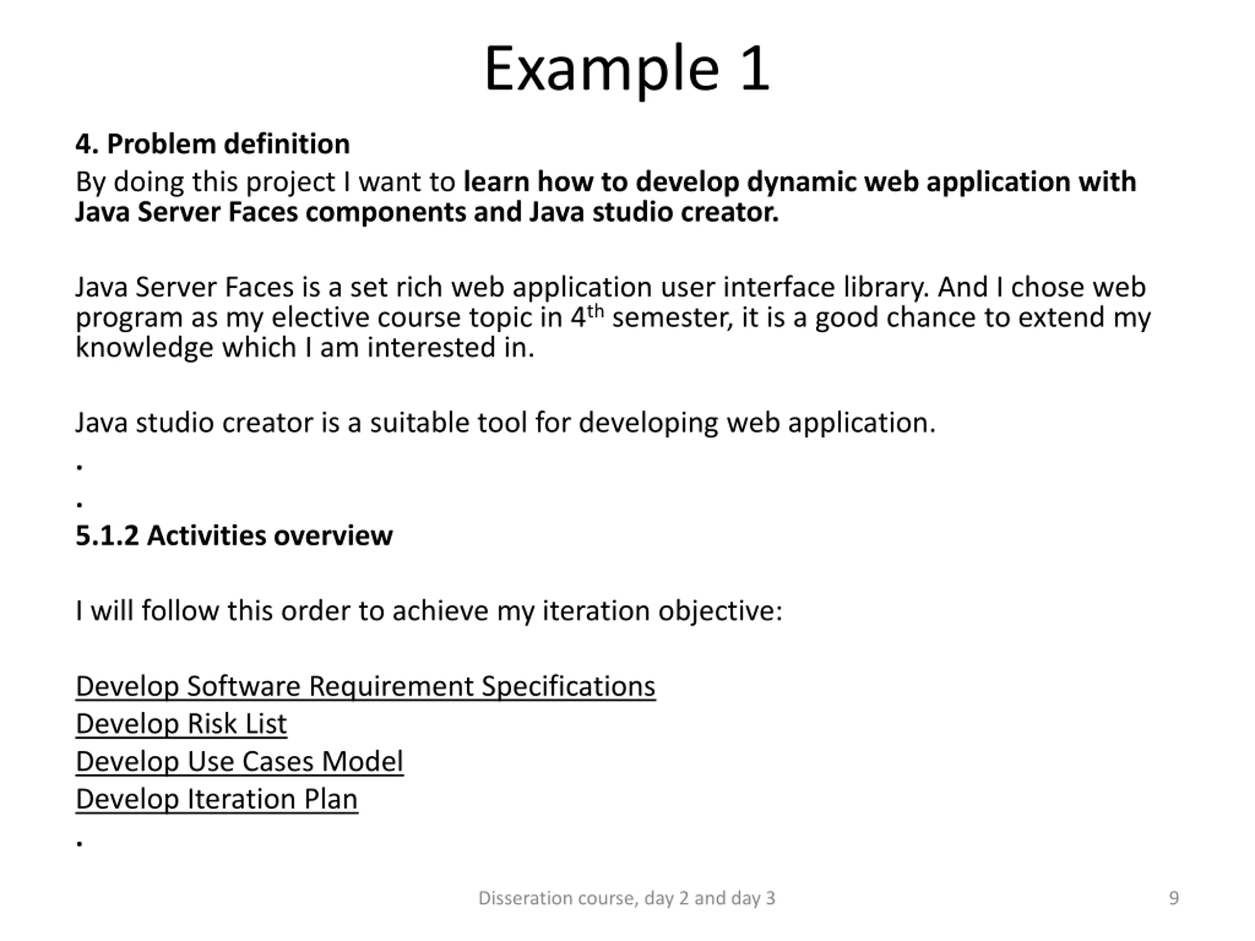 Example 1 4. Problem definition By doing this project I want to learn how to develop dynamic web application with Java Server Faces components and Java studio creator. Java Server Faces is a set rich web application user interface library. And I chose web program as my elective course topic in 4thsemester, it is a good chance to extend my knowledge which I am interested in. Java studio creator is a suitable tool for developing web application. . . 5.1.2 Activities overview I will follow this order to achieve my iteration objective: Develop Software Requirement Specifications Develop Risk List Develop Use Cases Model Develop Iteration Plan . Disseration course, day 2 and day 3 9