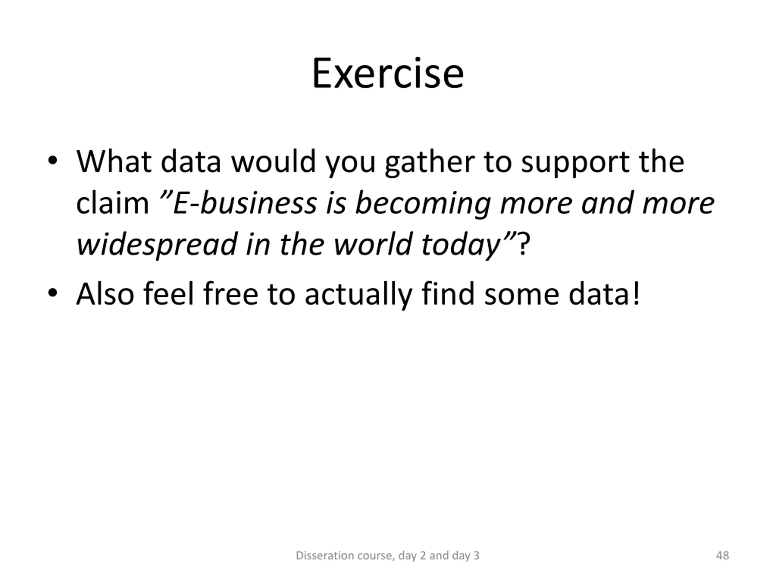 Exercise What data would you gather to support the claim E-business is becoming more and more widespread in the world today ? Also feel free to actually find some data! Disseration course, day 2 and day 3 48