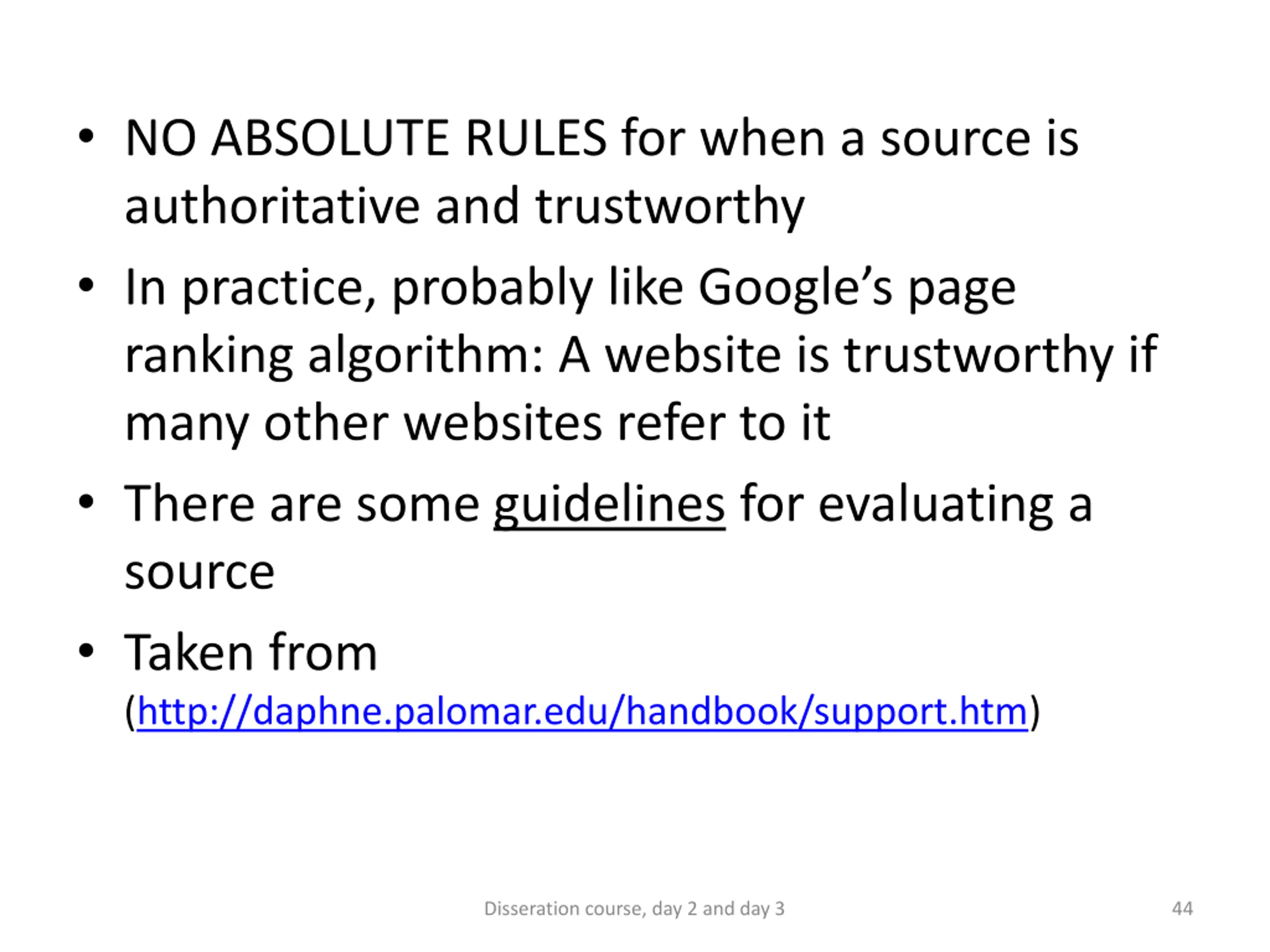 NO ABSOLUTE RULES for when a source is authoritative and trustworthy In practice, probably like Google s page ranking algorithm: A website is trustworthy if many other websites refer to it There are some guidelines for evaluating a source Taken from (http://daphne.palomar.edu/handbook/support.htm) Disseration course, day 2 and day 3 44