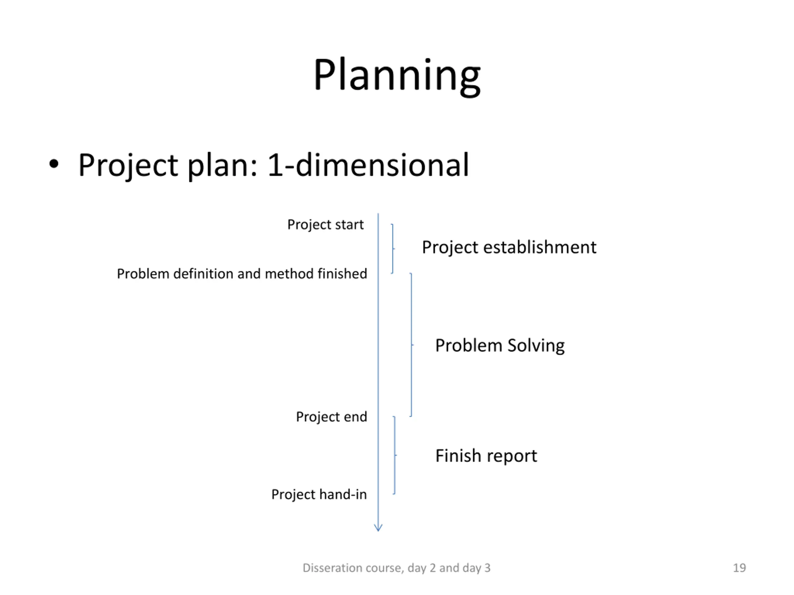 Planning Before: Decide the focus area(s) for your dissertation project Make a good problem definition Method: Decide what to do in order to answer the problem definition question(s) Make a plan (order of the activities) for your dissertation project Disseration course, day 2 and day 3 18