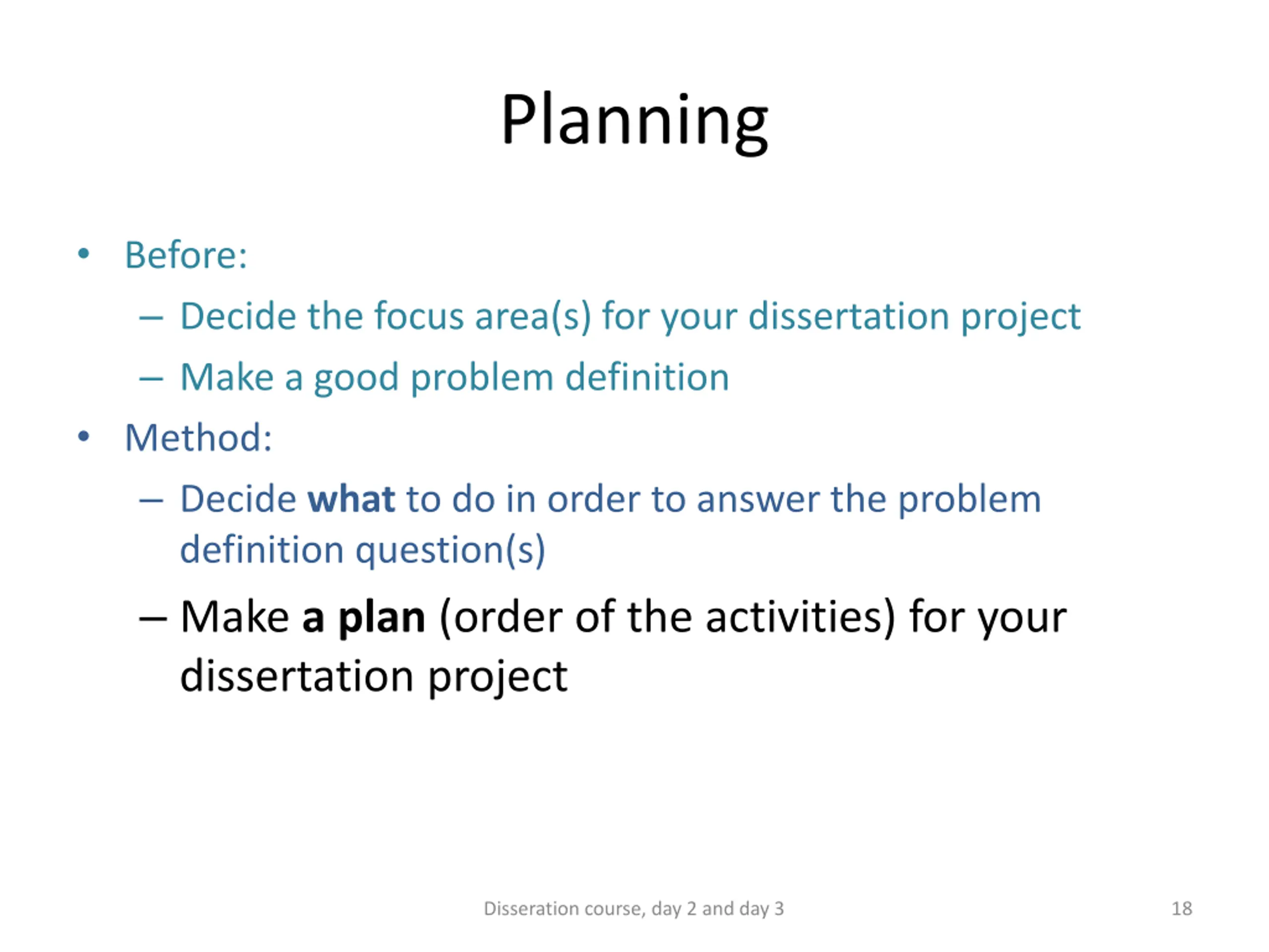 Method Before: Decide the focus area(s) for your dissertation project Make a good problem definition Method: Decide what to do in order to answer the problem definition question(s) Make a plan (order of the activities) for your dissertation project Disseration course, day 2 and day 3 7