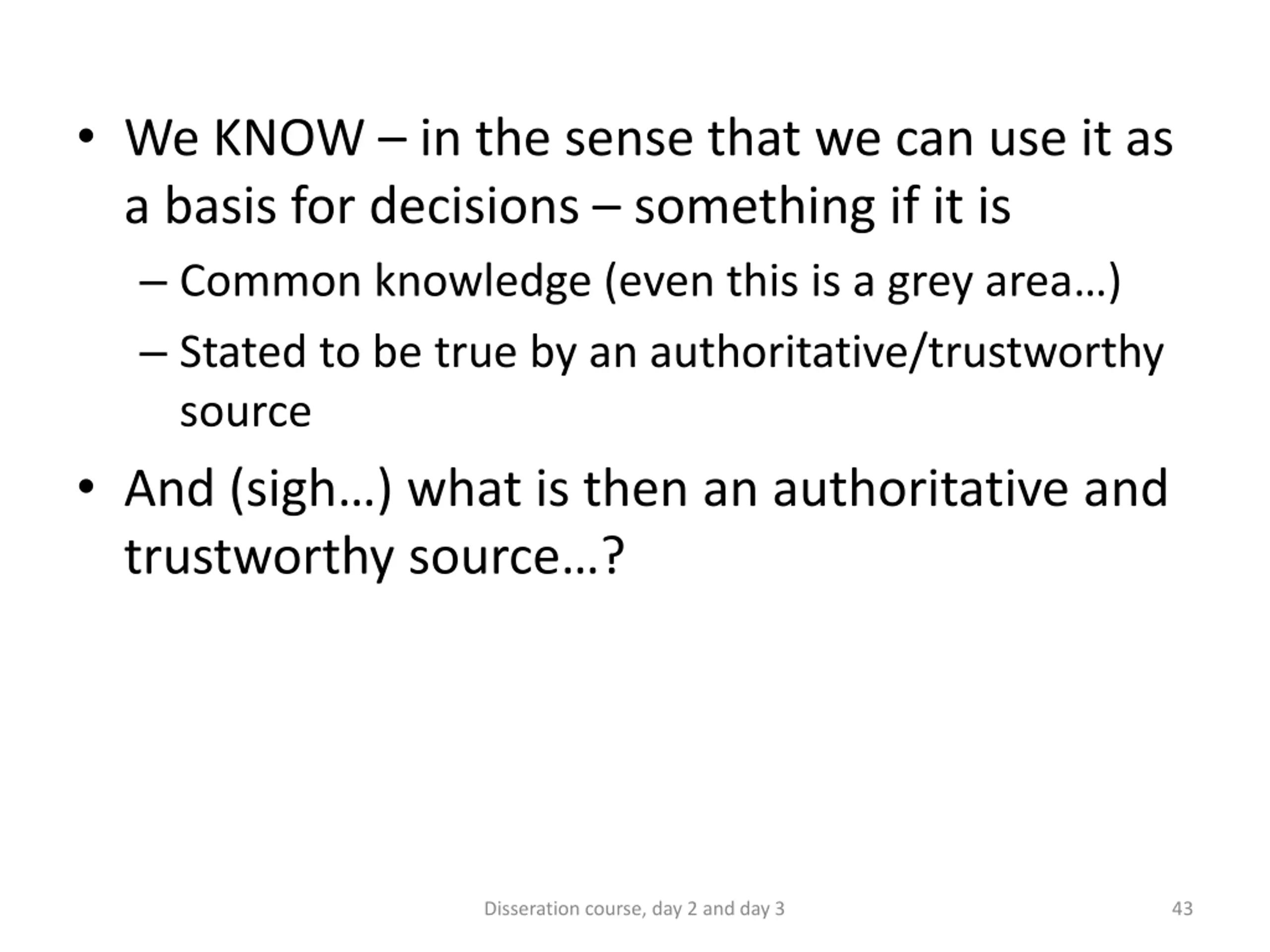We KNOW in the sense that we can use it as a basis for decisions something if it is Common knowledge (even this is a grey area ) Stated to be true by an authoritative/trustworthy source And (sigh ) what is then an authoritative and trustworthy source ? Disseration course, day 2 and day 3 43