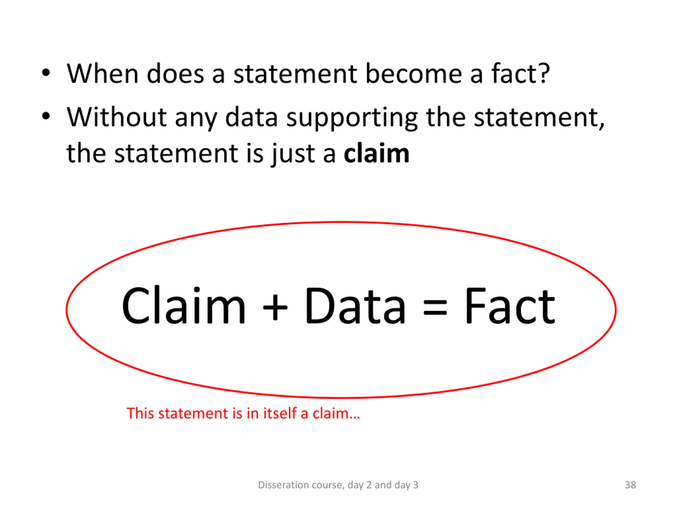 When does a statement become a fact? Without any data supporting the statement, the statement is just a claim Claim + Data = Fact This statement is in itself a claim Disseration course, day 2 and day 3 38