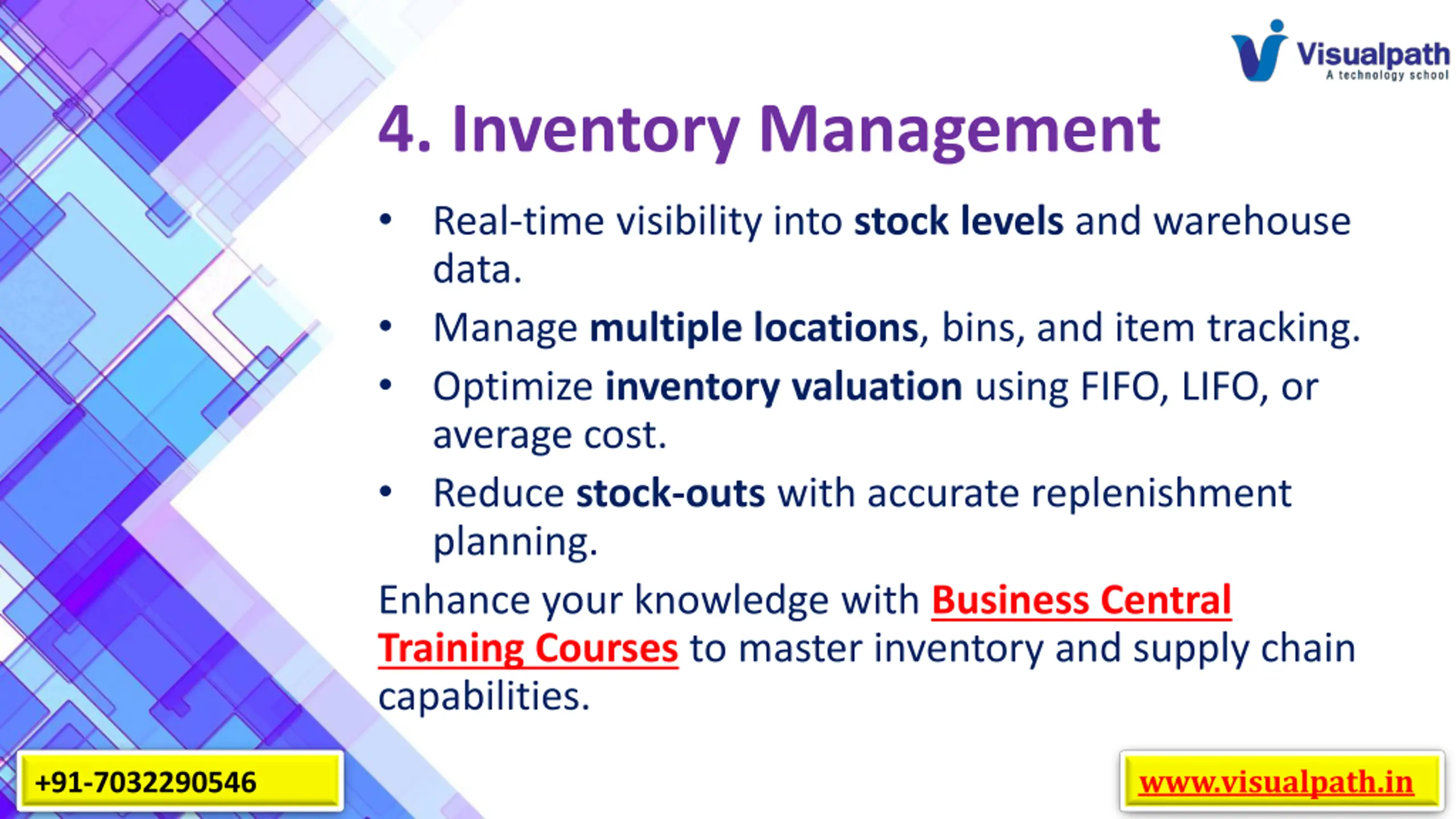 4. Inventory Management Real-time visibility into stock levels and warehouse data. Manage multiple locations, bins, and item tracking. Optimize inventory valuation using FIFO, LIFO, or average cost. Reduce stock-outs with accurate replenishment planning. Enhance your knowledge with Business Central Training Courses to master inventory and supply chain capabilities. www.visualpath.in +91-7032290546