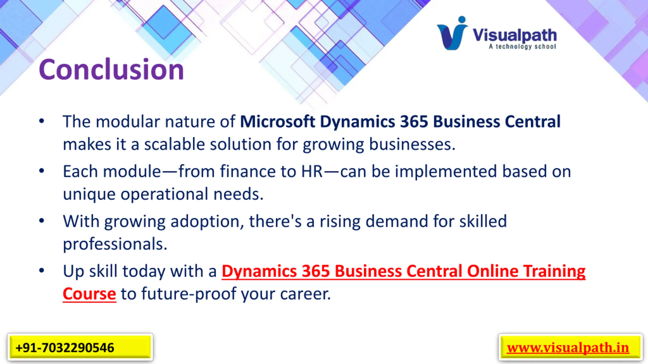 Conclusion The modular nature of Microsoft Dynamics 365 Business Central makes it a scalable solution for growing businesses. Each module from finance to HR can be implemented based on unique operational needs. With growing adoption, there's a rising demand for skilled professionals. Up skill today with a Dynamics 365 Business Central Online Training Course to future-proof your career. www.visualpath.in +91-7032290546