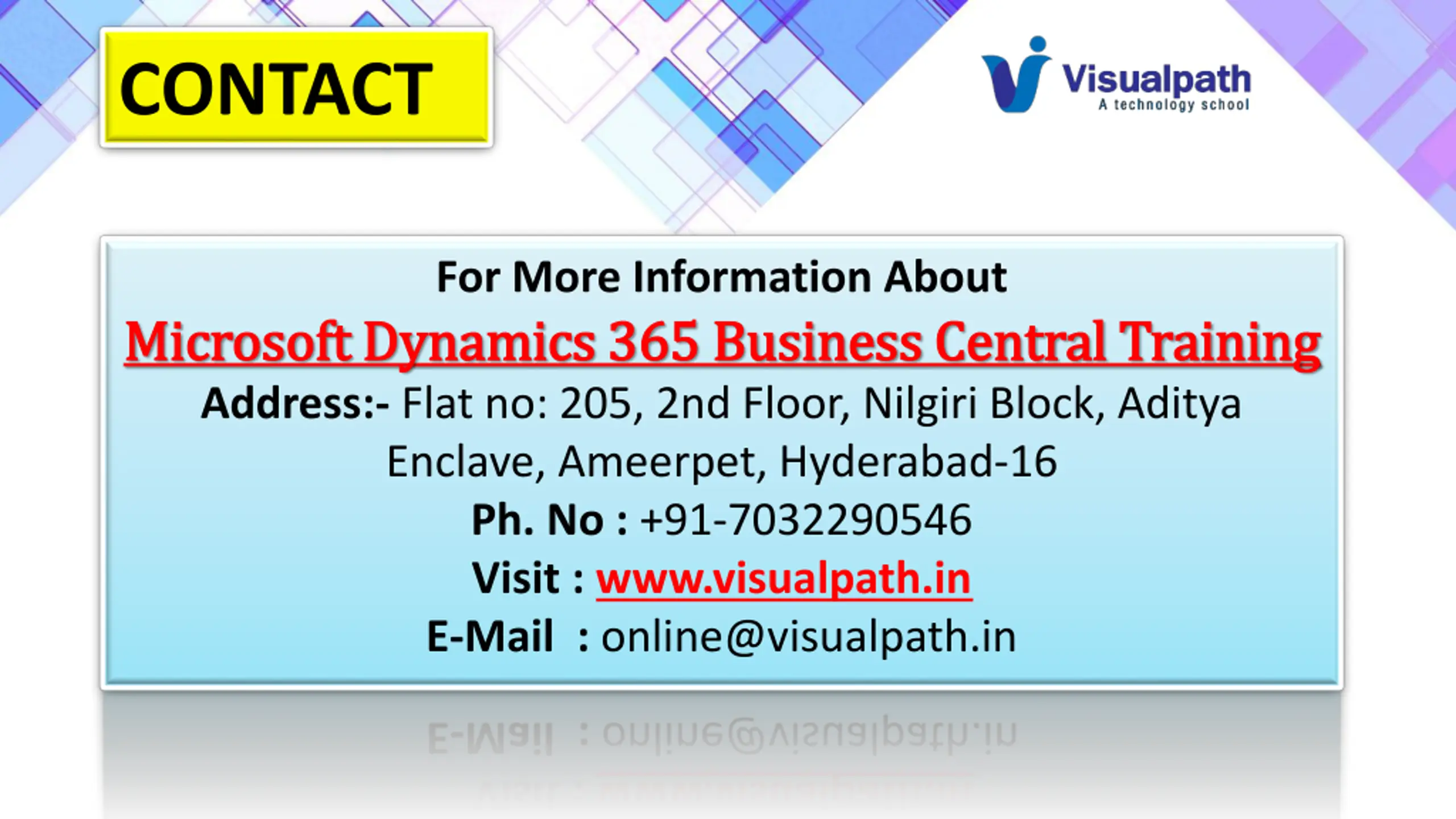 CONTACT For More Information About Microsoft Dynamics 365 Business Central Training Microsoft Dynamics 365 Business Central Training Address:- Flat no: 205, 2nd Floor, Nilgiri Block, Aditya Enclave, Ameerpet, Hyderabad-16 Ph. No : +91-7032290546 Visit : www.visualpath.in E-Mail : online@visualpath.in
