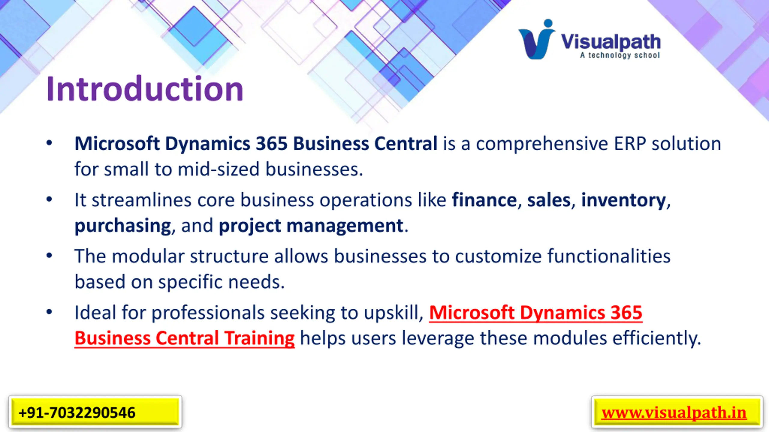 Introduction Microsoft Dynamics 365 Business Central is a comprehensive ERP solution for small to mid-sized businesses. It streamlines core business operations like finance, sales, inventory, purchasing, and project management. The modular structure allows businesses to customize functionalities based on specific needs. Ideal for professionals seeking to upskill, Microsoft Dynamics 365 Business Central Training helps users leverage these modules efficiently. www.visualpath.in +91-7032290546