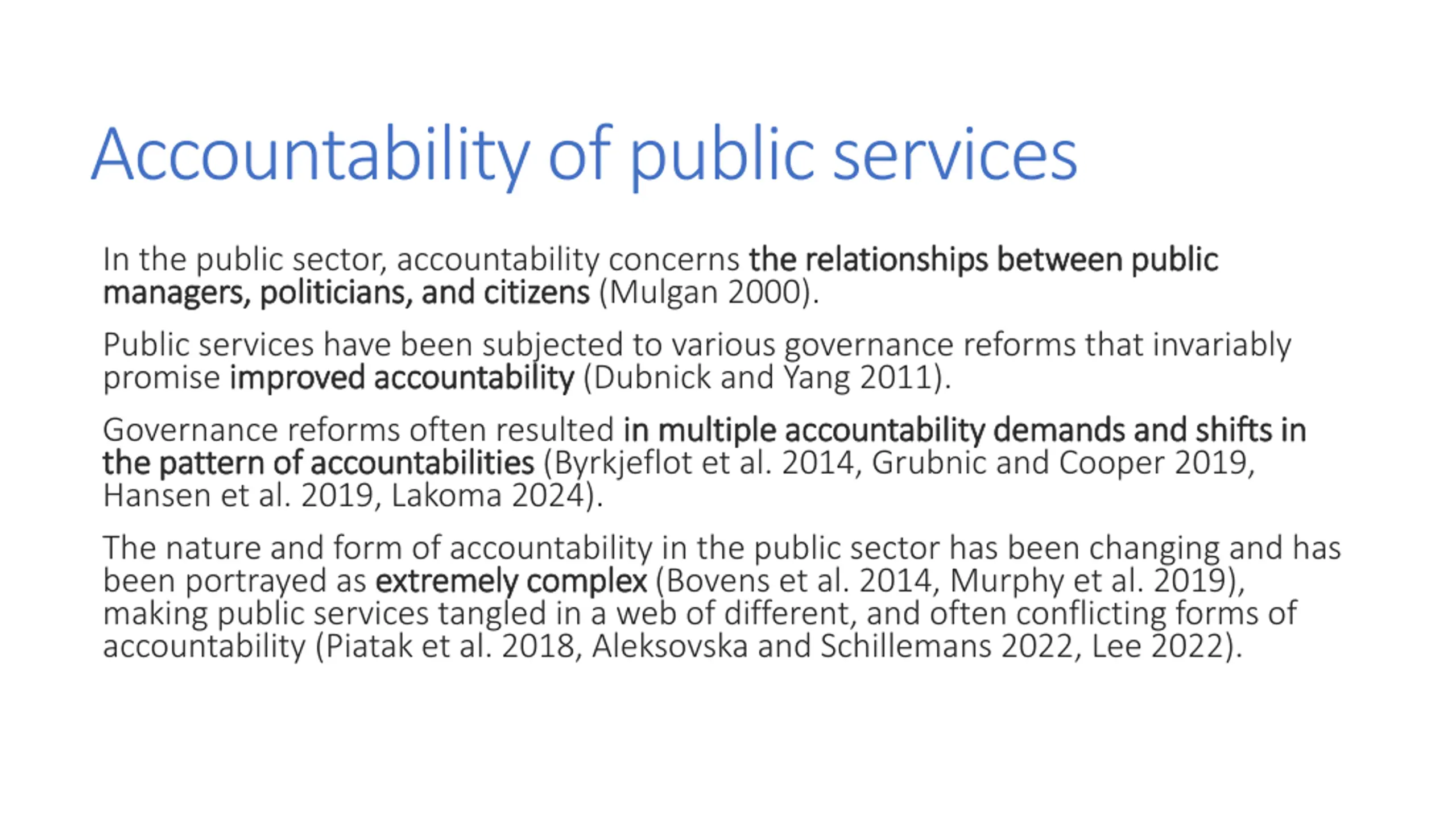 Accountability of public services In the public sector, accountability concerns the relationships between public managers, politicians, and citizens managers, politicians, and citizens (Mulgan 2000). Public services have been subjected to various governance reforms that invariably promise improved accountability improved accountability (Dubnick and Yang 2011). Governance reforms often resulted in multiple accountability demands and shifts in in multiple accountability demands and shifts in the pattern of accountabilities the pattern of accountabilities (Byrkjeflot et al. 2014, Grubnic and Cooper 2019, Hansen et al. 2019, Lakoma 2024). The nature and form of accountability in the public sector has been changing and has been portrayed as extremely complex extremely complex (Bovens et al. 2014, Murphy et al. 2019), making public services tangled in a web of different, and often conflicting forms of accountability (Piatak et al. 2018, Aleksovska and Schillemans 2022, Lee 2022). the relationships between public