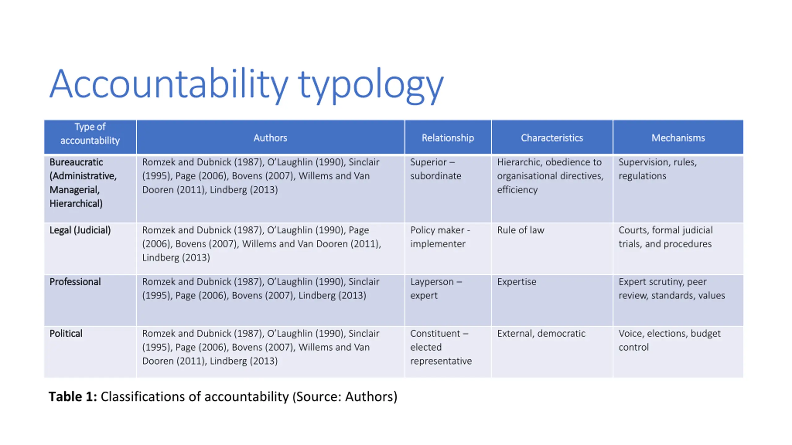 Accountability typology Type of Type of accountability accountability Authors Authors Relationship Relationship Characteristics Characteristics Mechanisms Mechanisms Bureaucratic Bureaucratic (Administrative, (Administrative, Managerial, Managerial, Hierarchical) Hierarchical) Romzek and Dubnick (1987), O Laughlin (1990), Sinclair (1995), Page (2006), Bovens (2007), Willems and Van Dooren (2011), Lindberg (2013) Superior subordinate Hierarchic, obedience to organisational directives, efficiency Supervision, rules, regulations Legal (Judicial) Legal (Judicial) Romzek and Dubnick (1987), O Laughlin (1990), Page (2006), Bovens (2007), Willems and Van Dooren (2011), Lindberg (2013) Policy maker - implementer Rule of law Courts, formal judicial trials, and procedures Professional Professional Romzek and Dubnick (1987), O Laughlin (1990), Sinclair (1995), Page (2006), Bovens (2007), Lindberg (2013) Layperson expert Expertise Expert scrutiny, peer review, standards, values Political Political Romzek and Dubnick (1987), O Laughlin (1990), Sinclair (1995), Page (2006), Bovens (2007), Willems and Van Dooren (2011), Lindberg (2013) Constituent elected representative External, democratic Voice, elections, budget control Table 1:Classifications of accountability (Source: Authors)