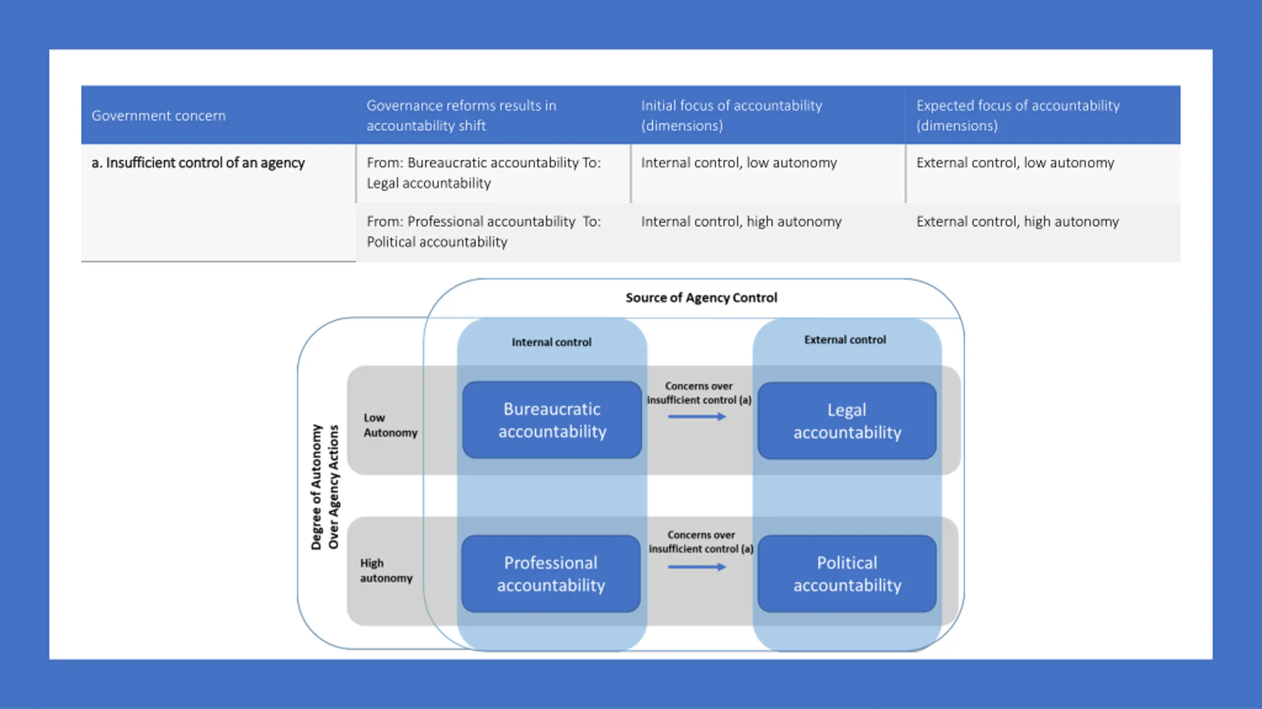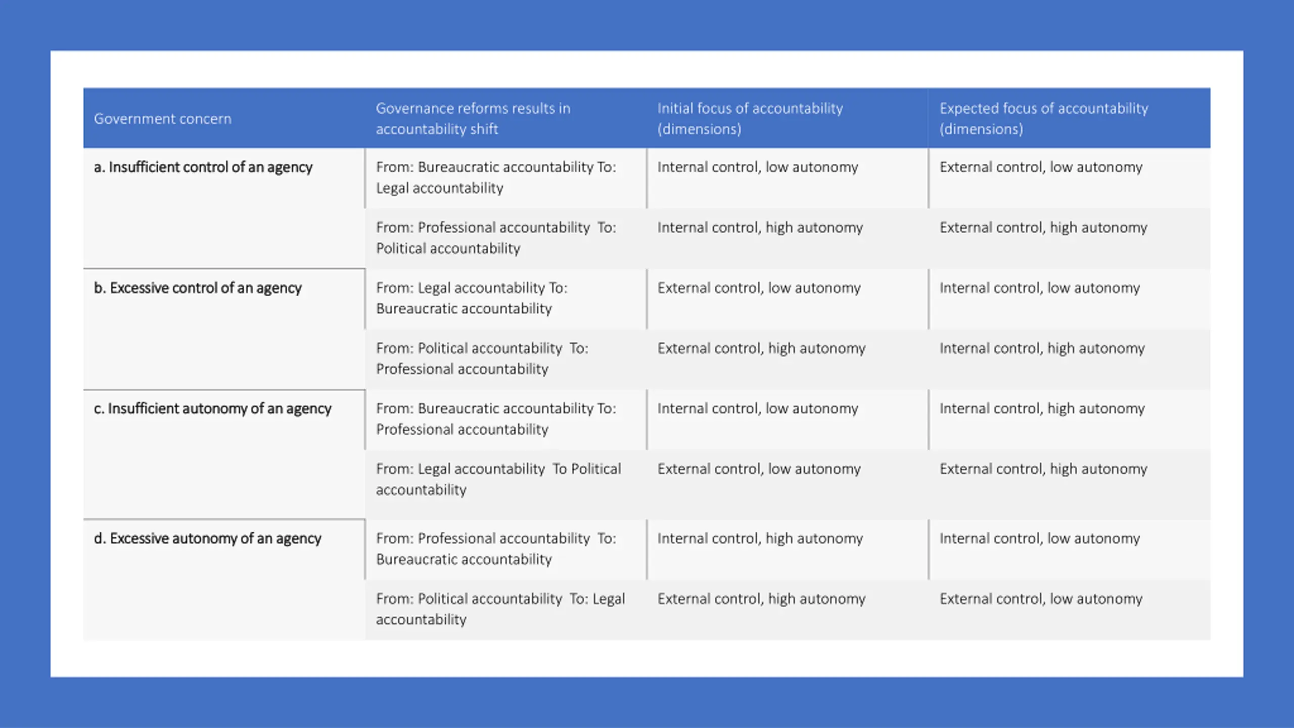 Governance reforms results in accountability shift Initial focus of accountability (dimensions) Expected focus of accountability (dimensions) Government concern a. Insufficient control of an agency a. Insufficient control of an agency From: Bureaucratic accountability To: Legal accountability Internal control, low autonomy External control, low autonomy From: Professional accountability To: Political accountability Internal control, high autonomy External control, high autonomy b. Excessive control of an agency b. Excessive control of an agency From: Legal accountability To: Bureaucratic accountability External control, low autonomy Internal control, low autonomy From: Political accountability To: Professional accountability External control, high autonomy Internal control, high autonomy c. Insufficient autonomy of an agency c. Insufficient autonomy of an agency From: Bureaucratic accountability To: Professional accountability Internal control, low autonomy Internal control, high autonomy From: Legal accountability To Political accountability External control, low autonomy External control, high autonomy d. Excessive autonomy of an agency d. Excessive autonomy of an agency From: Professional accountability To: Bureaucratic accountability Internal control, high autonomy Internal control, low autonomy From: Political accountability To: Legal accountability External control, high autonomy External control, low autonomy