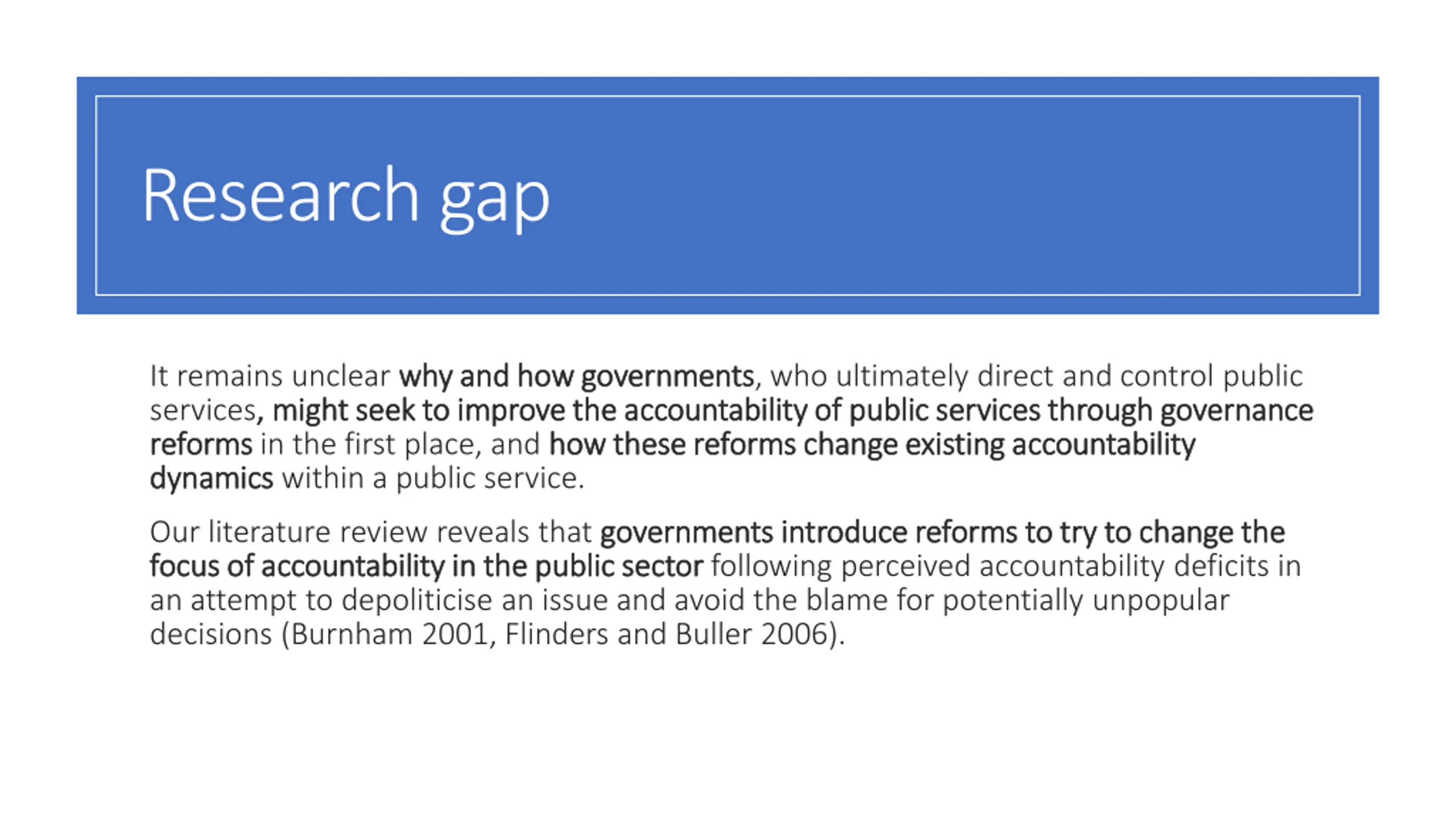 Research gap It remains unclear why and how governments why and how governments, who ultimately direct and control public services, might seek to improve the accountability of public services through governance , might seek to improve the accountability of public services through governance reforms reforms in the first place, and how these reforms change existing accountability how these reforms change existing accountability dynamics dynamics within a public service. Our literature review reveals that governments introduce reforms to try to change the governments introduce reforms to try to change the focus of accountability in the public sector focus of accountability in the public sector following perceived accountability deficits in an attempt to depoliticise an issue and avoid the blame for potentially unpopular decisions (Burnham 2001, Flinders and Buller 2006).