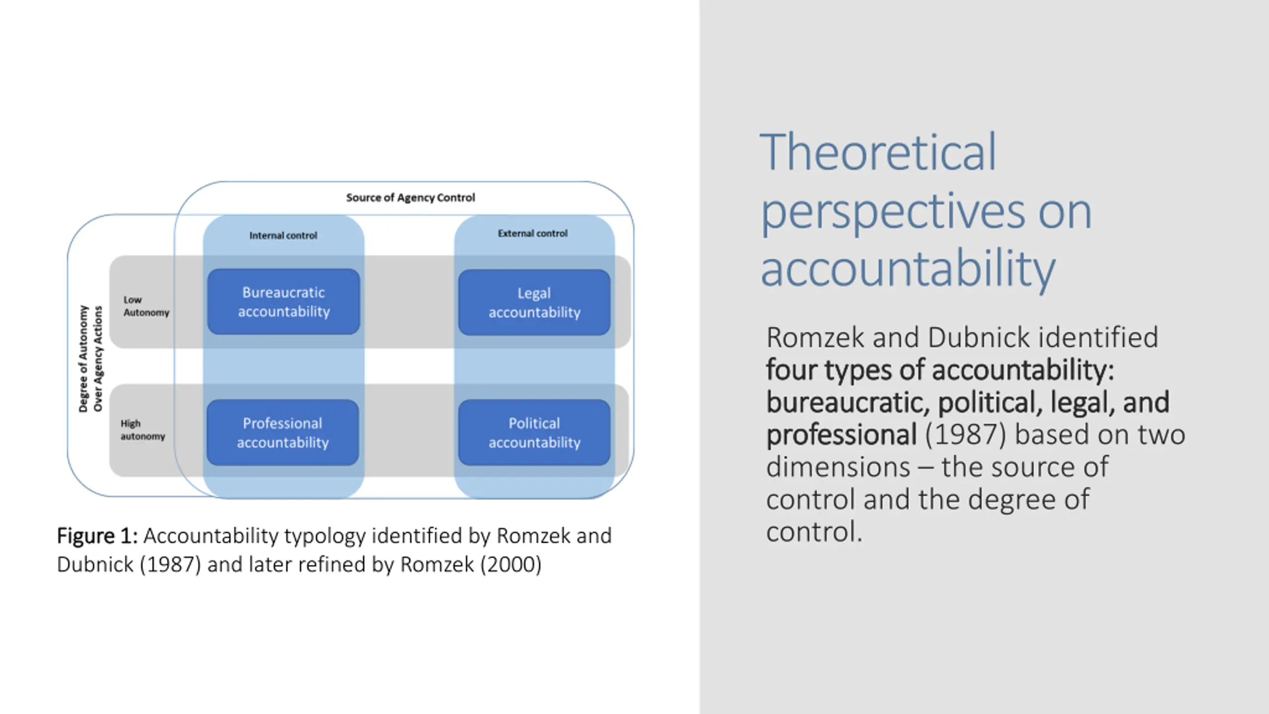 Theoretical perspectives on accountability Romzek and Dubnick identified four types of accountability: four types of accountability: bureaucratic, political, legal, and bureaucratic, political, legal, and professional professional (1987) based on two dimensions the source of control and the degree of control. Figure 1: Figure 1: Accountability typology identified by Romzek and Dubnick (1987) and later refined by Romzek (2000)