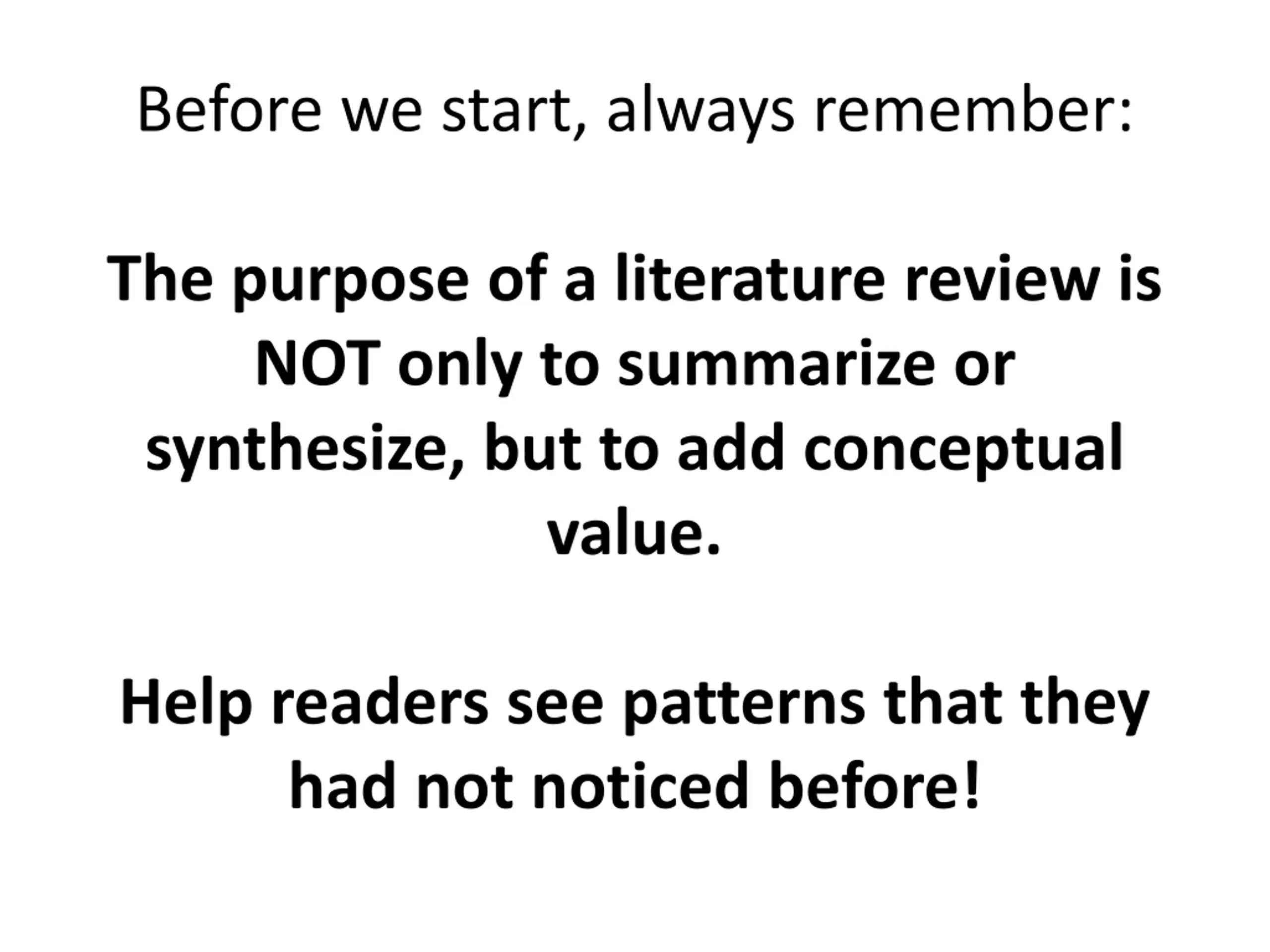 Before we start, always remember: The purpose of a literature review is NOT only to summarize or synthesize, but to add conceptual value. Help readers see patterns that they had not noticed before!
