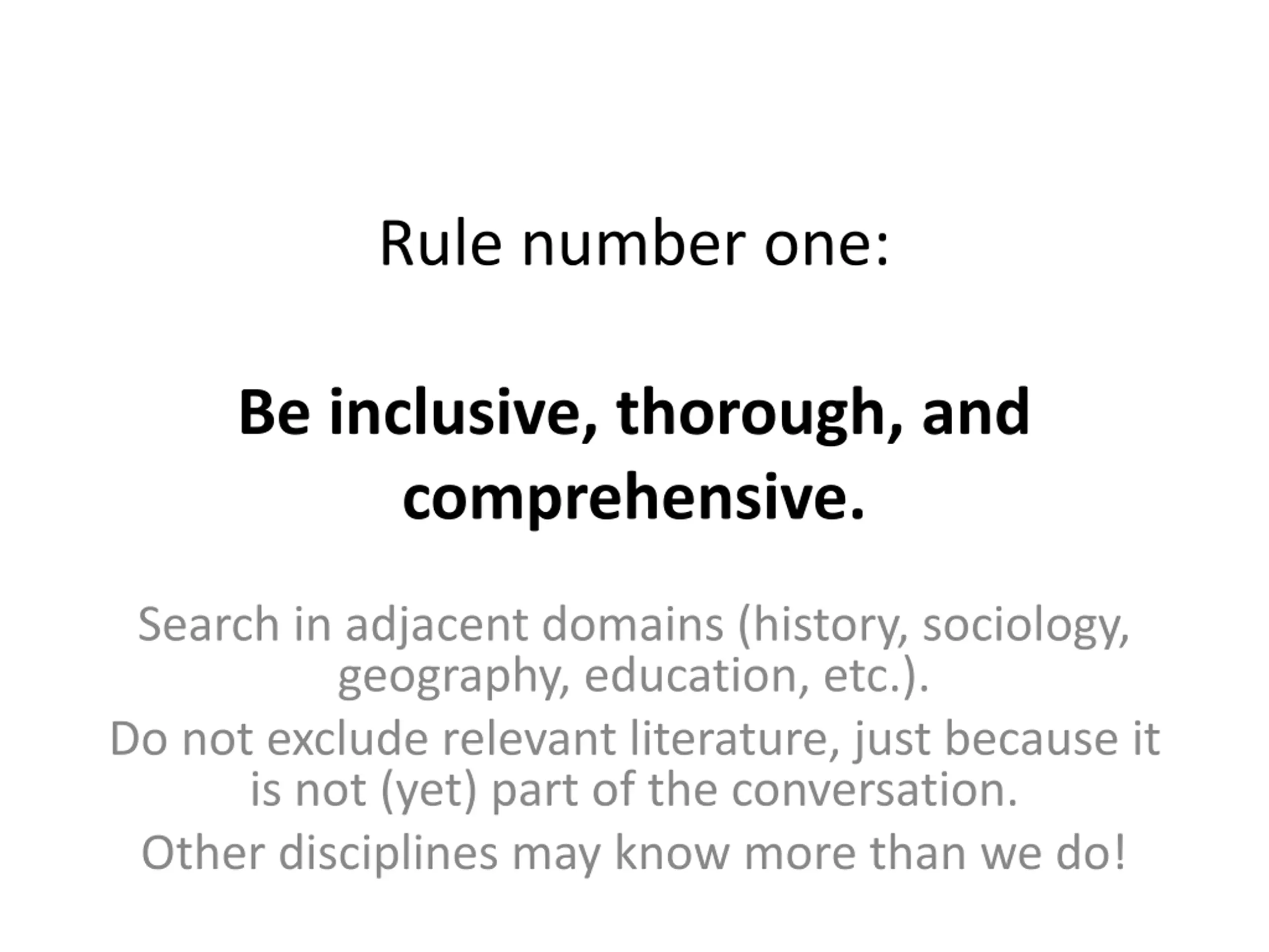 Rule number one: Be inclusive, thorough, and comprehensive. Search in adjacent domains (history, sociology, geography, education, etc.). Do not exclude relevant literature, just because it is not (yet) part of the conversation. Other disciplines may know more than we do!