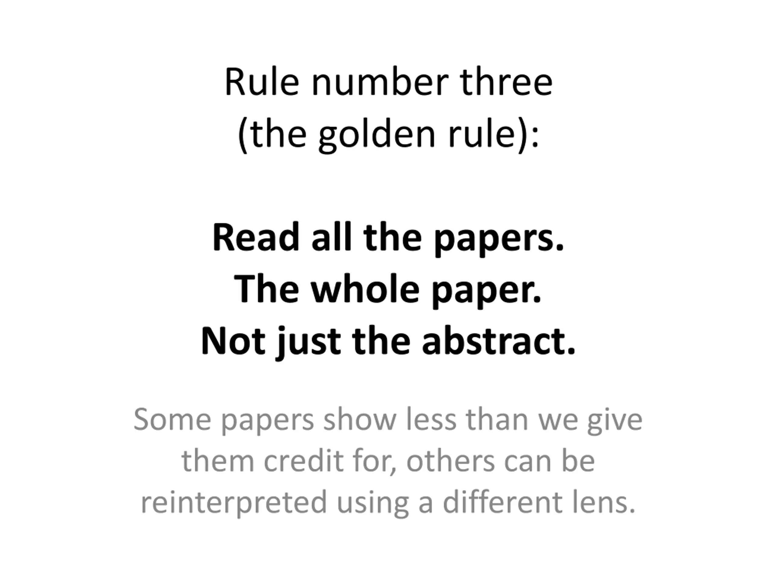 Rule number three (the golden rule): Read all the papers. The whole paper. Not just the abstract. Some papers show less than we give them credit for, others can be reinterpreted using a different lens.