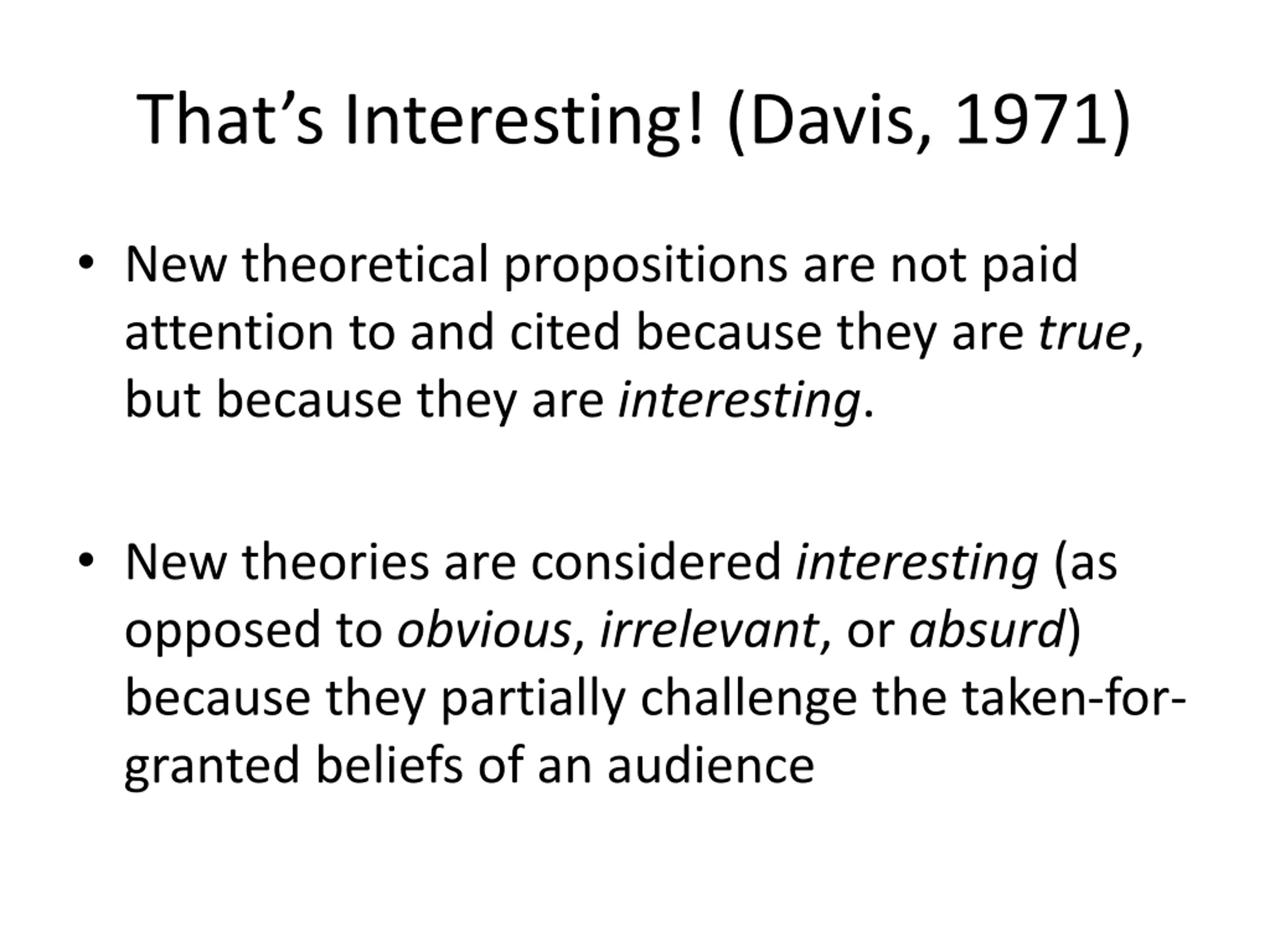 Thats Interesting! (Davis, 1971) New theoretical propositions are not paid attention to and cited because they are true, but because they are interesting. New theories are considered interesting (as opposed to obvious, irrelevant, or absurd) because they partially challenge the taken-for- granted beliefs of an audience