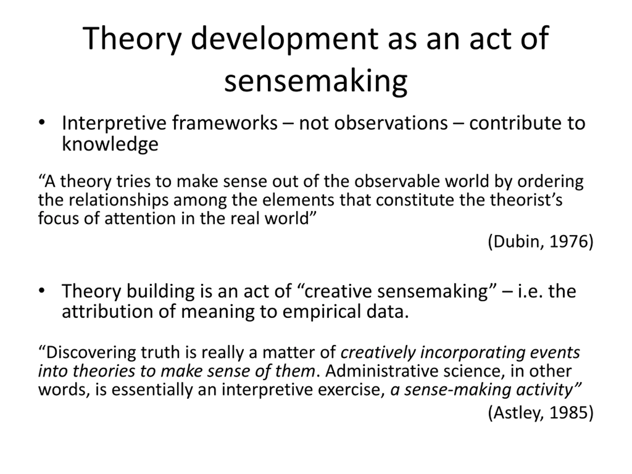 Theory development as an act of sensemaking Interpretive frameworks not observations contribute to knowledge A theory tries to make sense out of the observable world by ordering the relationships among the elements that constitute the theorist s focus of attention in the real world (Dubin, 1976) Theory building is an act of creative sensemaking i.e. the attribution of meaning to empirical data. Discovering truth is really a matter of creatively incorporating events into theories to make sense of them. Administrative science, in other words, is essentially an interpretive exercise, a sense-making activity (Astley, 1985)