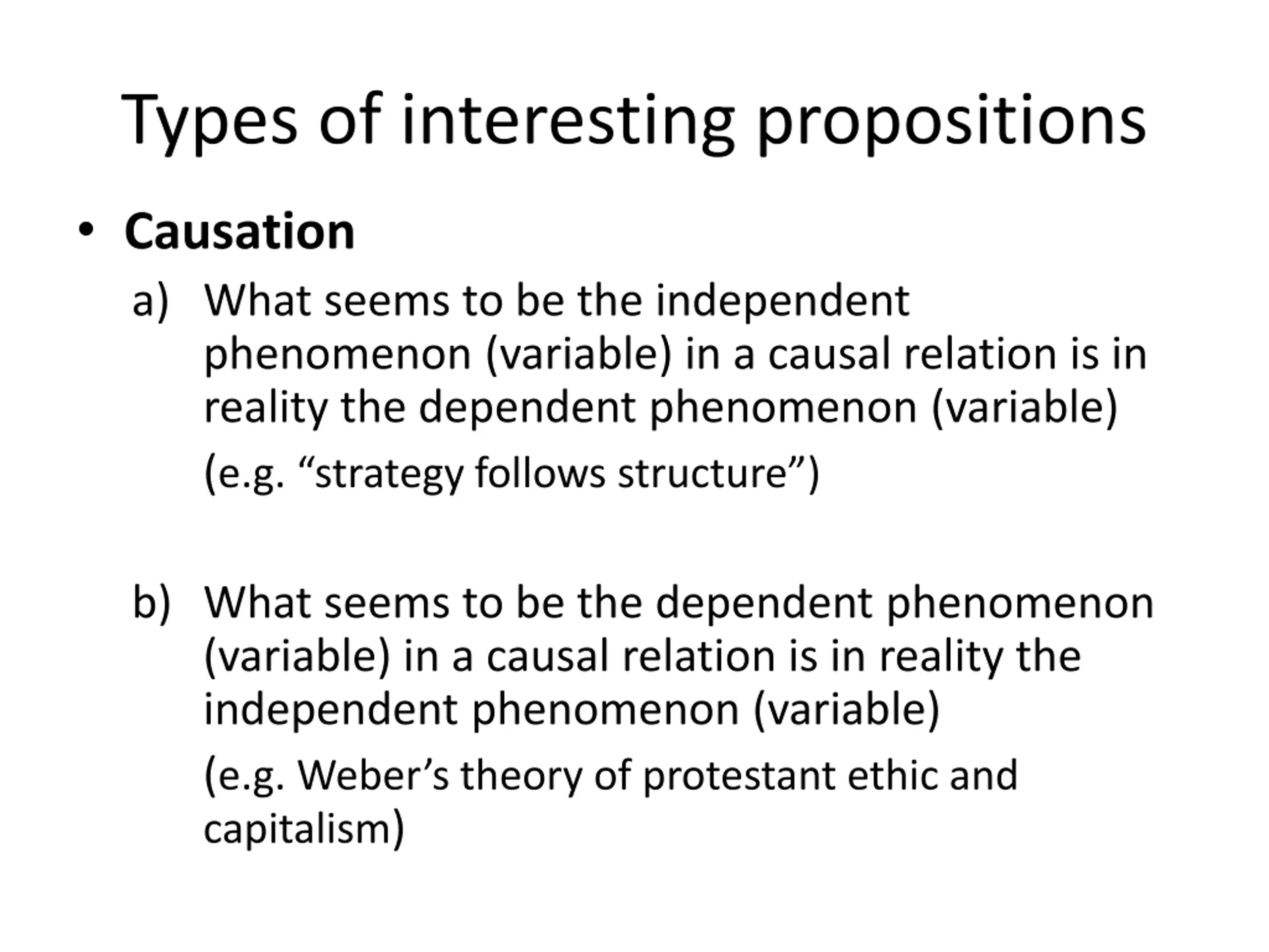 Types of interesting propositions Causation a) What seems to be the independent phenomenon (variable) in a causal relation is in reality the dependent phenomenon (variable) (e.g. strategy follows structure ) b) What seems to be the dependent phenomenon (variable) in a causal relation is in reality the independent phenomenon (variable) (e.g. Weber s theory of protestant ethic and capitalism)