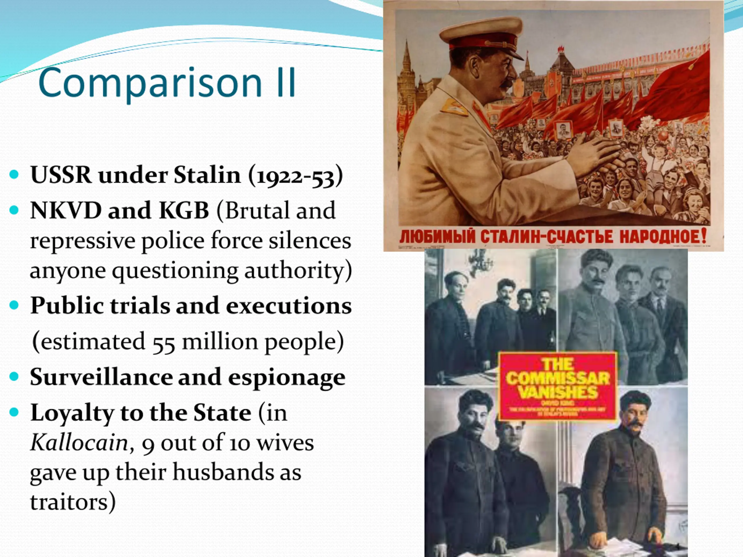 Comparison II USSR under Stalin (1922-53) NKVD and KGB (Brutal and repressive police force silences anyone questioning authority) Public trials and executions (estimated 55 million people) Surveillance and espionage Loyalty to the State (in Kallocain, 9 out of 10 wives gave up their husbands as traitors)